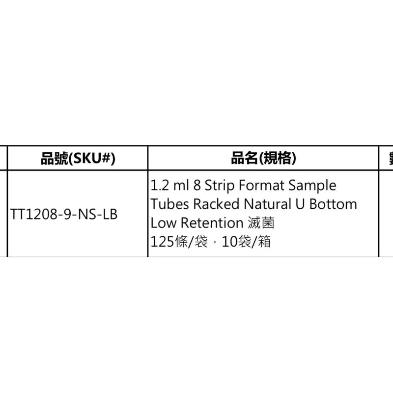 | TT1208-9-N-S-LB | 1.2ml | 低吸附 | 透明 | 12条/盒,10盒/中盒,5中盒/箱 | 730*250*345 | 7.76 |