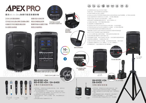 隱藏式的收納空間,可以容納四支無線麥克風、電源供應器和電源線,讓設備整潔有序。此外,兩段式伸縮把柄和大尺寸PE吸震滑輪,加上內建的大容量電池,讓您無論到哪裡,APEX PRO都能隨行隨用,方便移動。無論您是要應用在教學,會議或是活動,這台無線多功能擴音機一定會成為您的得力助手。在商業展示和博覽會中,這款設備也能提供穩定的音訊支持,讓您的展示更具吸引力。