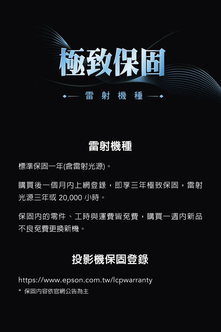 燈泡壽命:20,000 小時投射比範圍:0.25~0.62(數位式縮放)