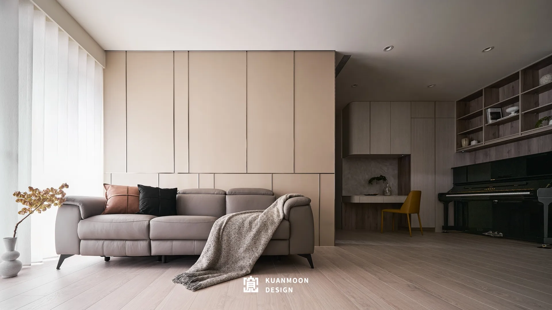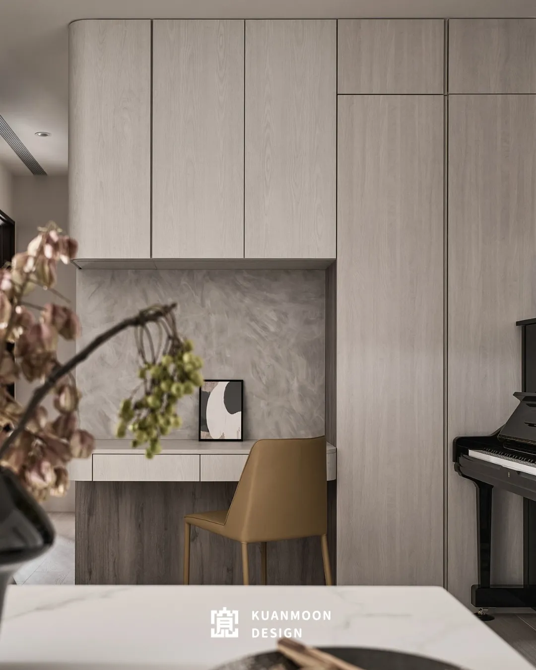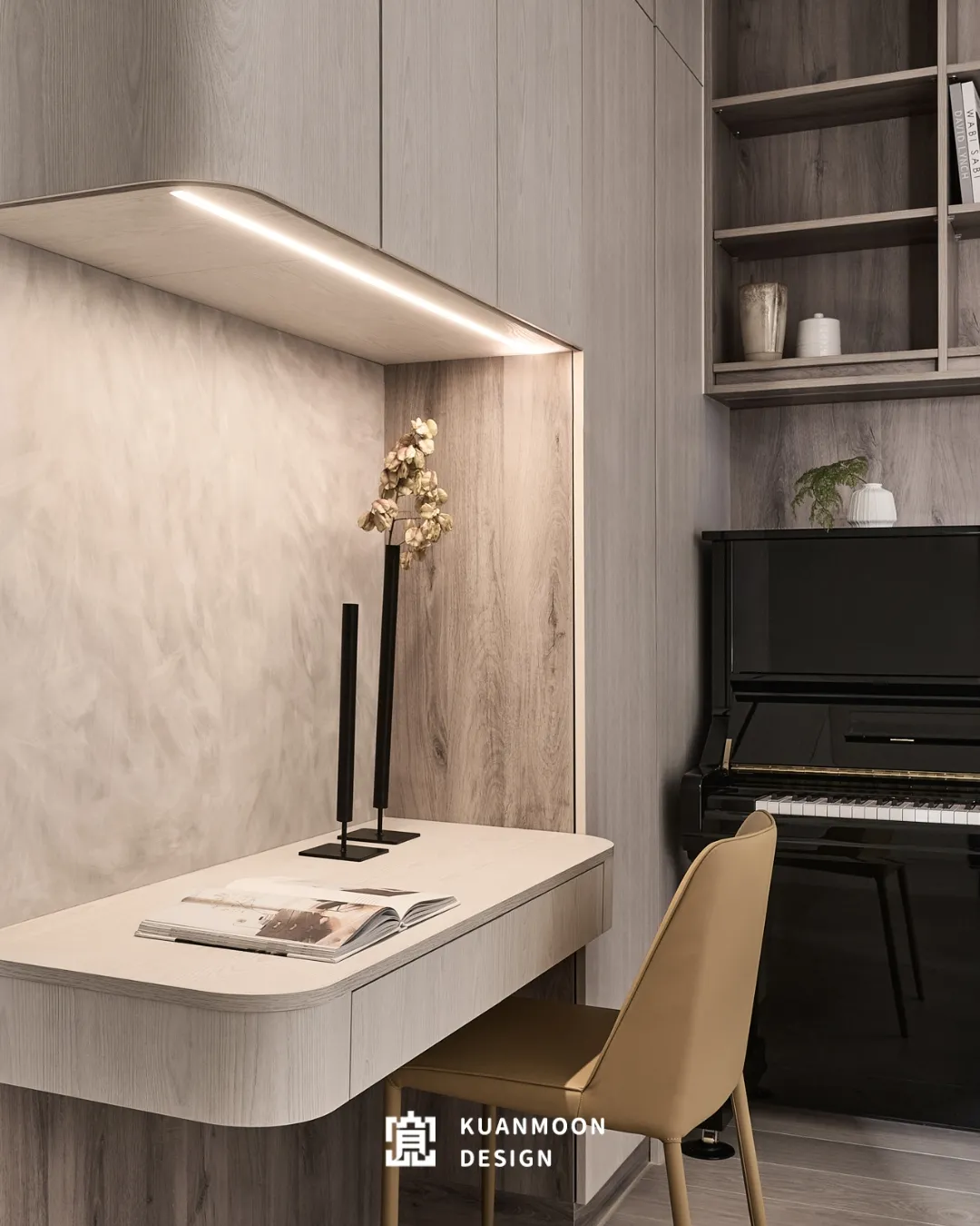 開放式配置串聯客廳、餐廳與琴間,動線清晰而流暢。櫃體與電視牆大量採用隱藏式收納設計,讓機能退居畫面之後,視覺回歸乾淨比例。木質飾面與大理石紋理相互對話,在秩序中建立材質節奏,避免空間流於平面。