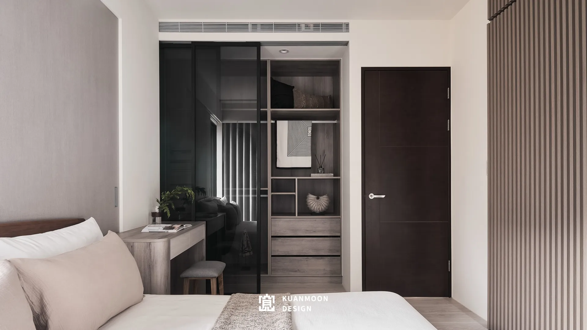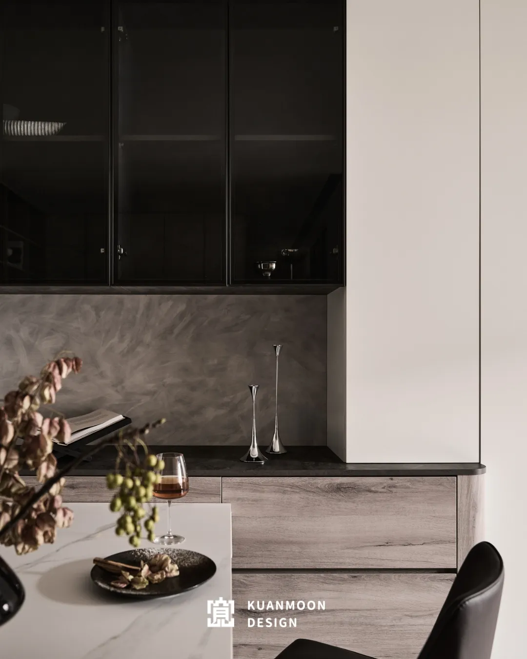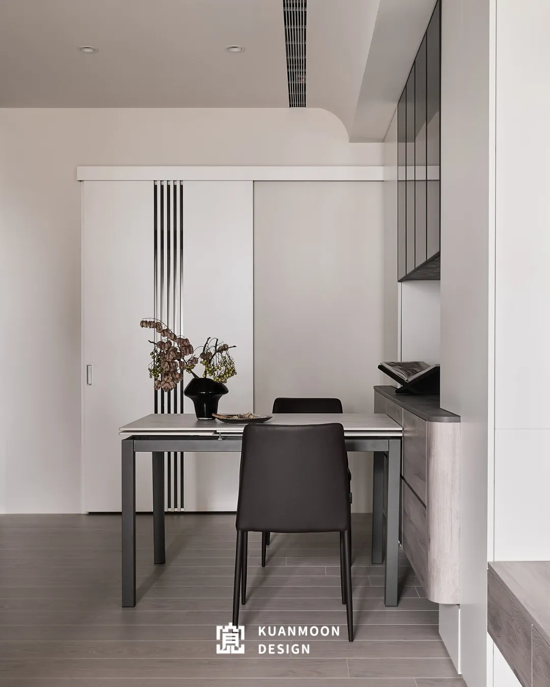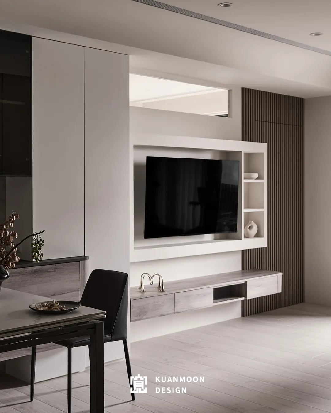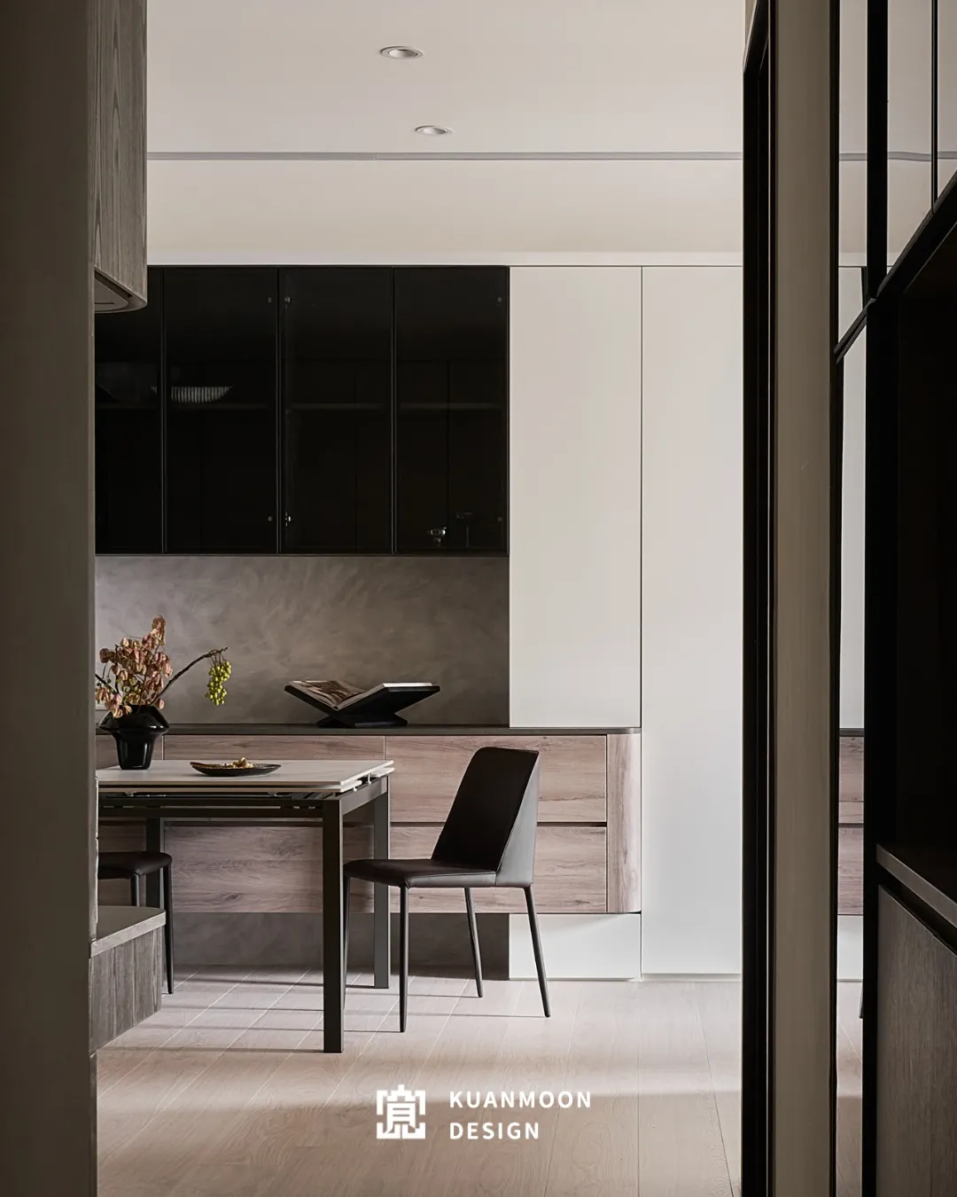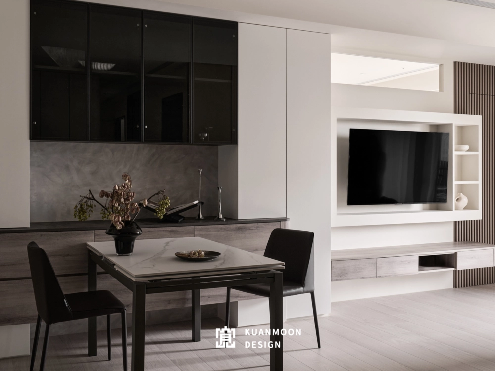 以現代輕奢為基調,空間透過中性色與異材質的層次鋪陳,勾勒出理性而不冷調的生活場景。白、灰與木色構成穩定背景,黑色玻璃與金屬細節作為視覺錨點,使整體在簡約之中保有精緻張力。