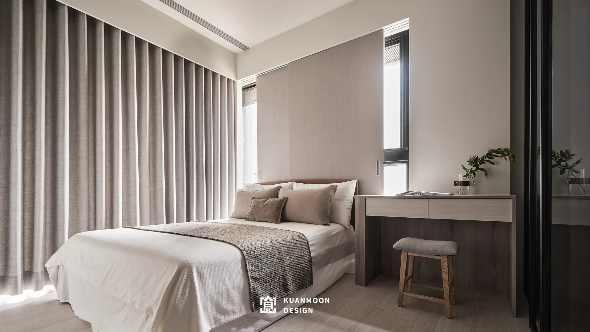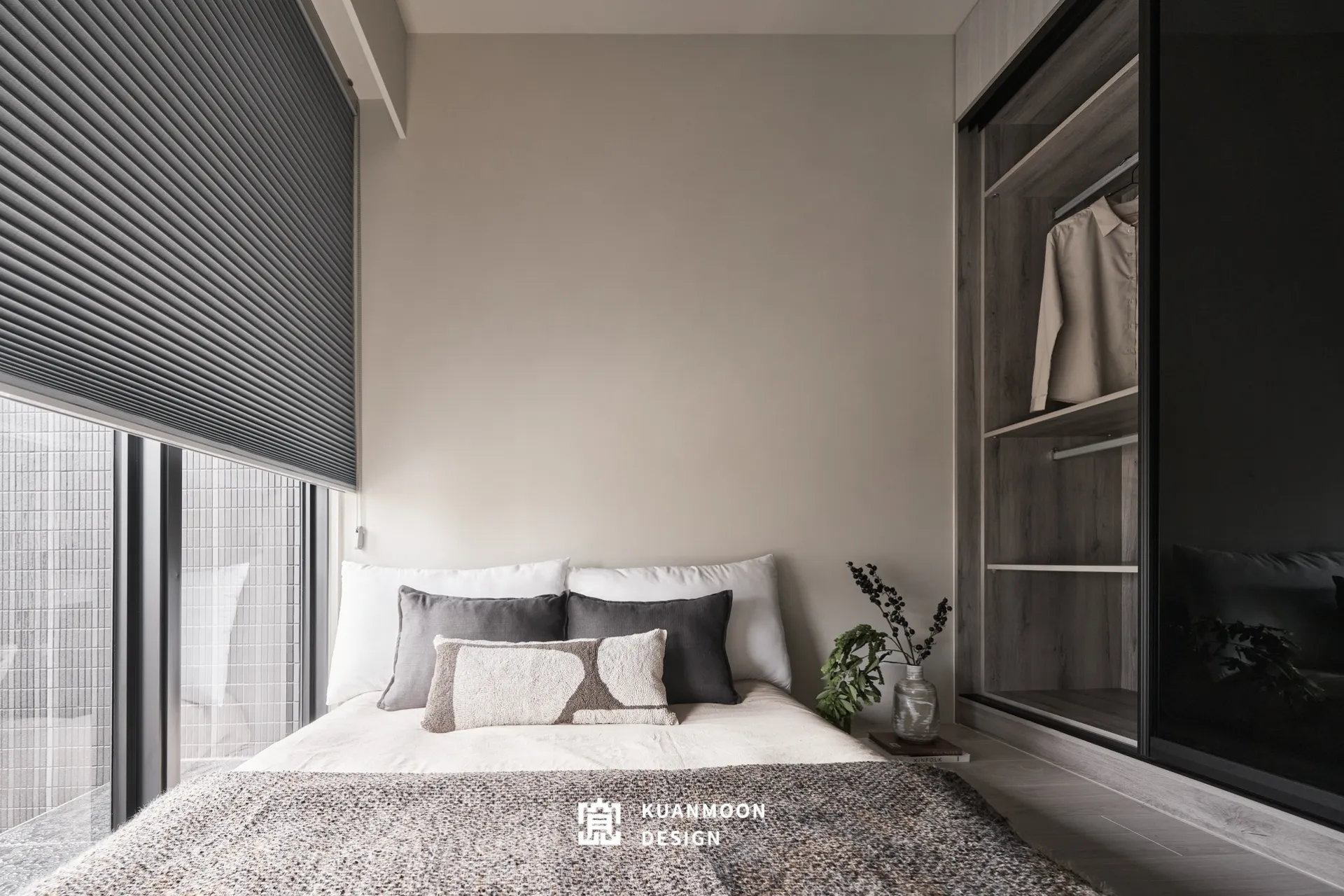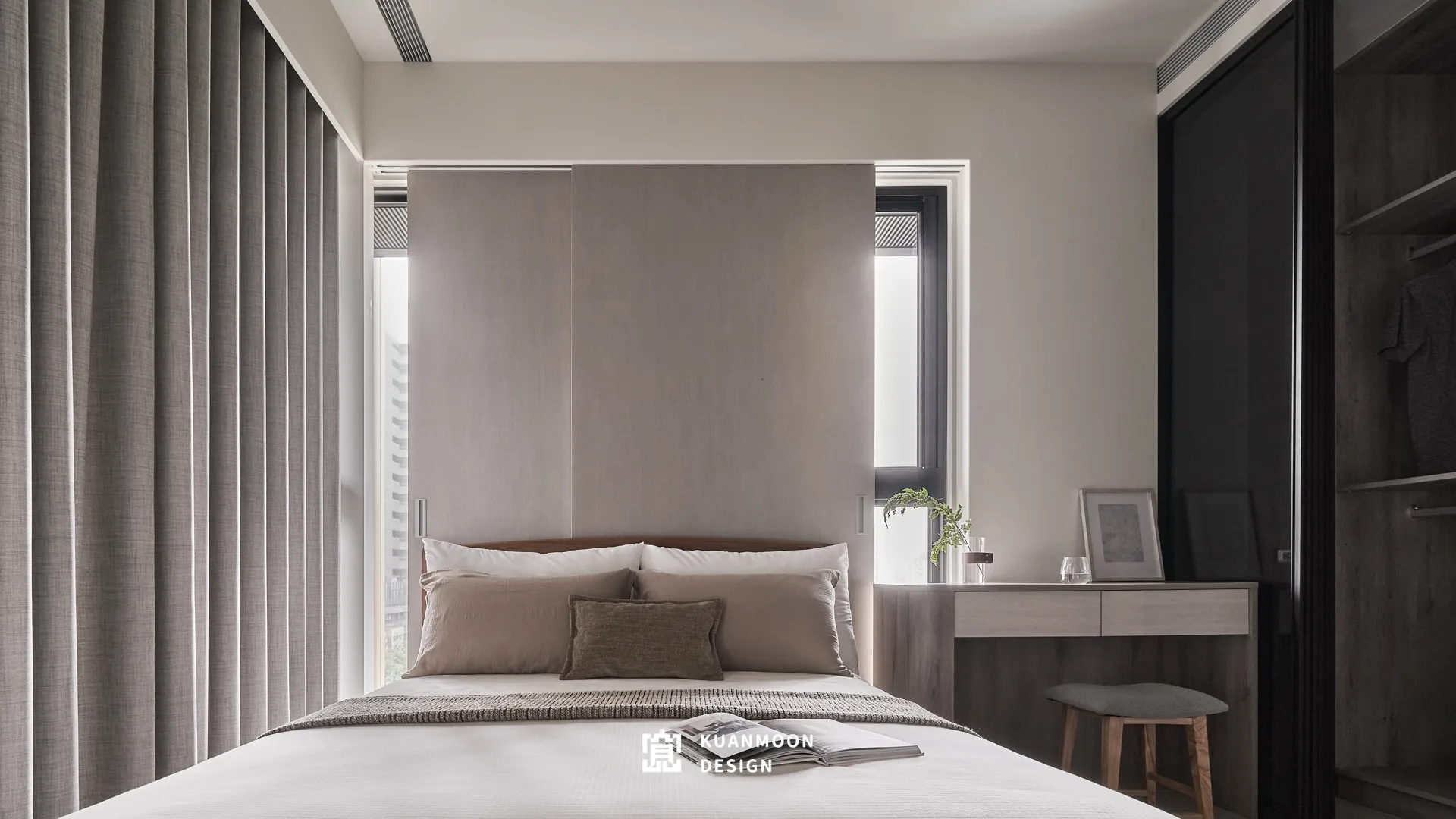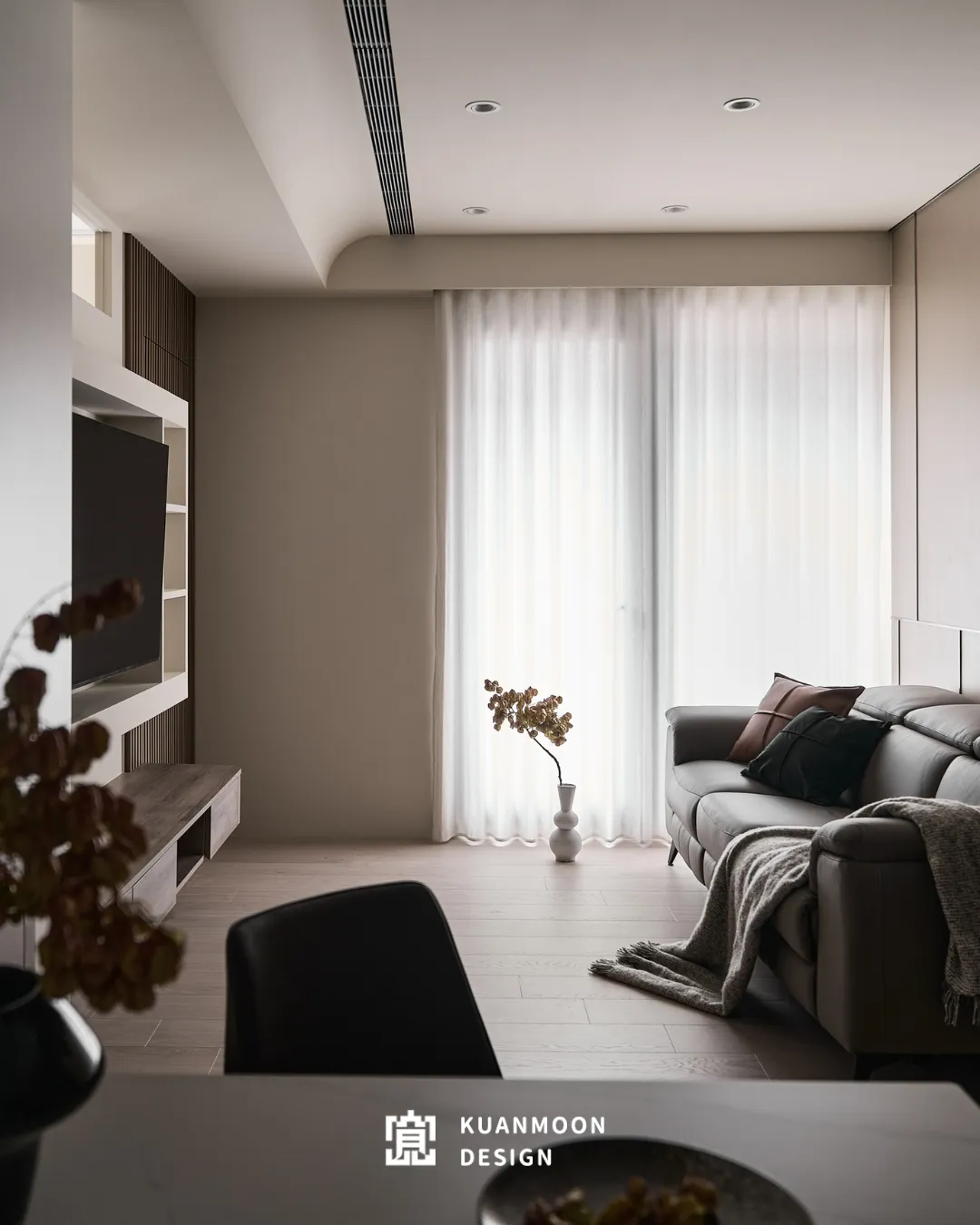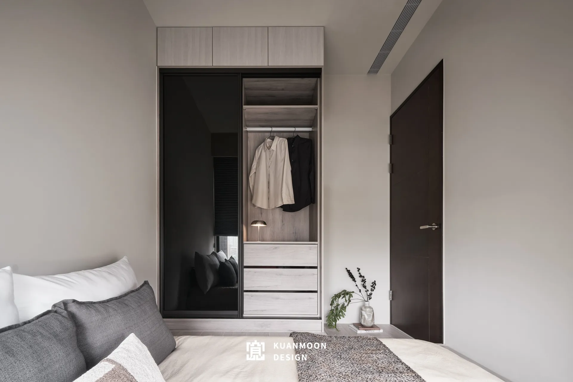 以現代輕奢為基調,空間透過中性色與異材質的層次鋪陳,勾勒出理性而不冷調的生活場景。白、灰與木色構成穩定背景,黑色玻璃與金屬細節作為視覺錨點,使整體在簡約之中保有精緻張力。