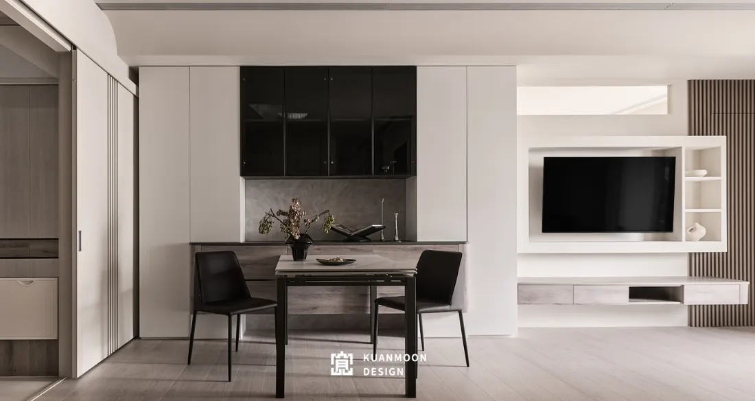 餐廚區以黑色玻璃櫃門與金屬結構作為點綴,低調中帶出輕奢氣息;皮革質感座椅則平衡了空間的溫度與舒適度。整體設計不追求過度裝飾,而是透過比例、材質與色彩的精準拿捏,形塑出一種內斂而成熟的現代生活樣貌。