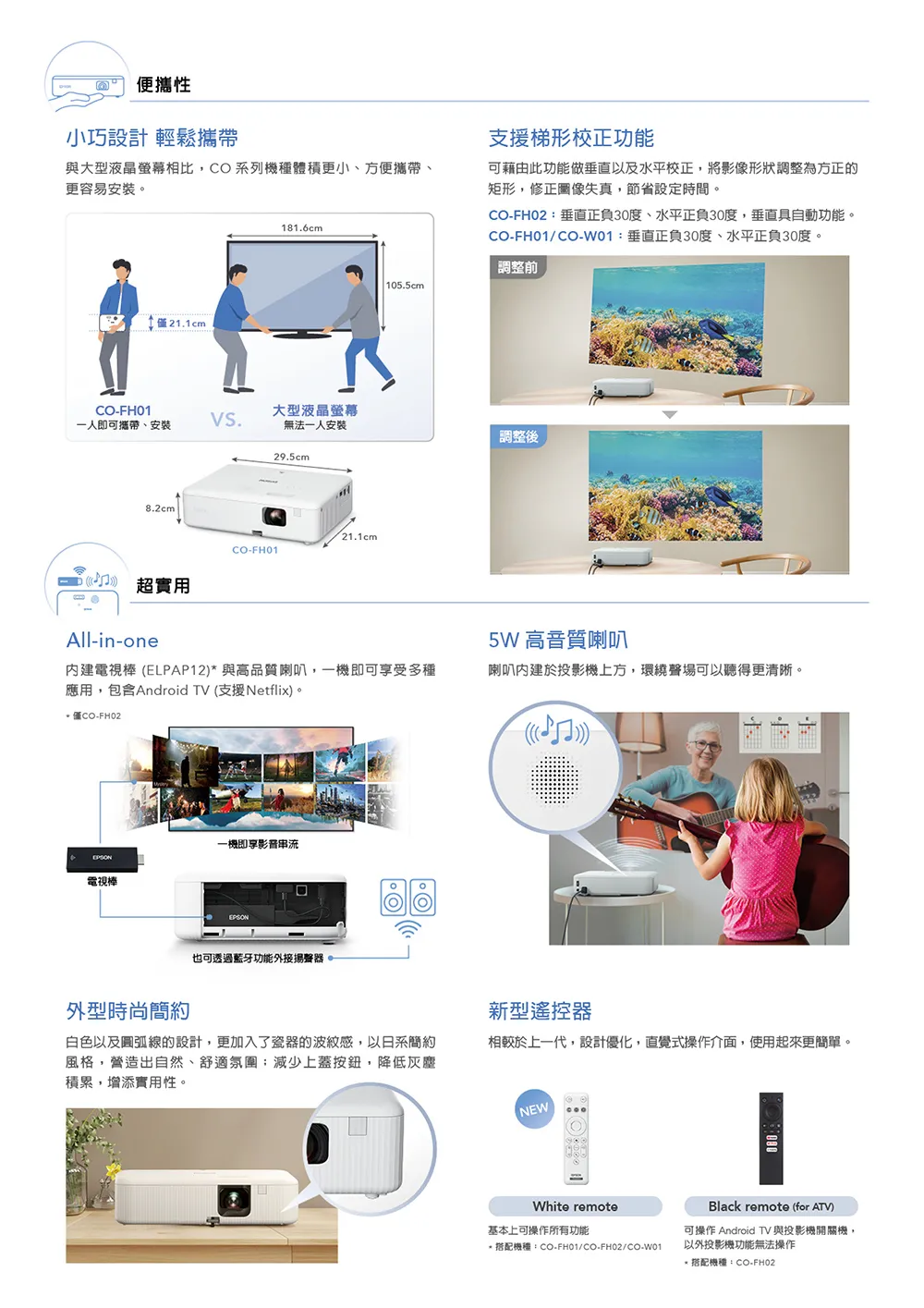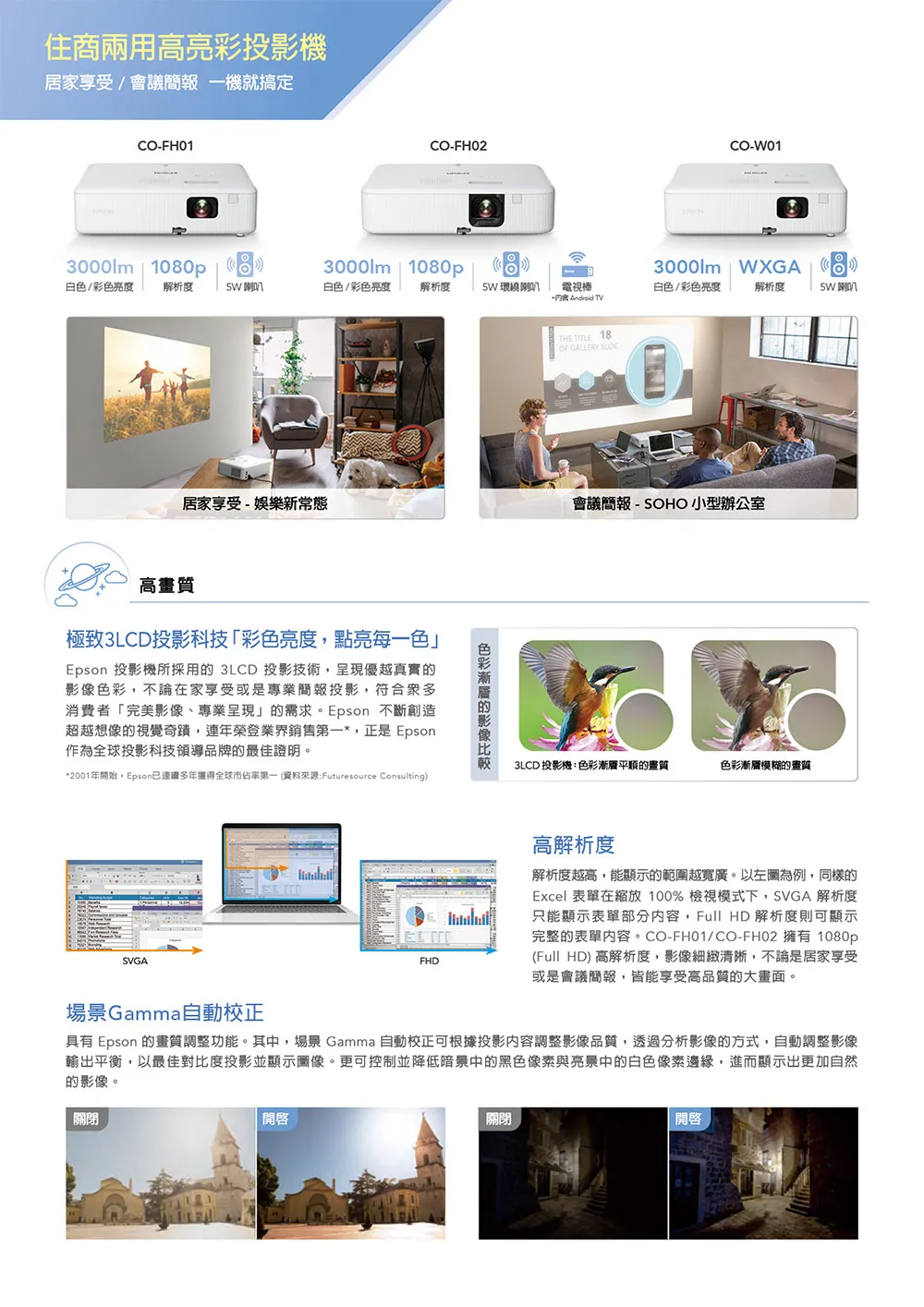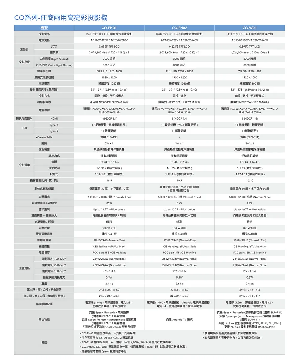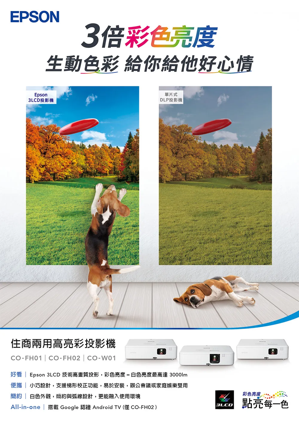 一般人挑選投影機都會注意流明度,也就是根據於全白區塊所測量的亮度,卻忽略了彩色亮度也是相當重要。全新Epson CO-FH01住商兩用投影機,採用3LCD投影技術,「白色亮度」及「彩色亮度」都達到3,000流明,投影免觀燈,不論從哪個角度觀賞,影像皆艷麗清晰。