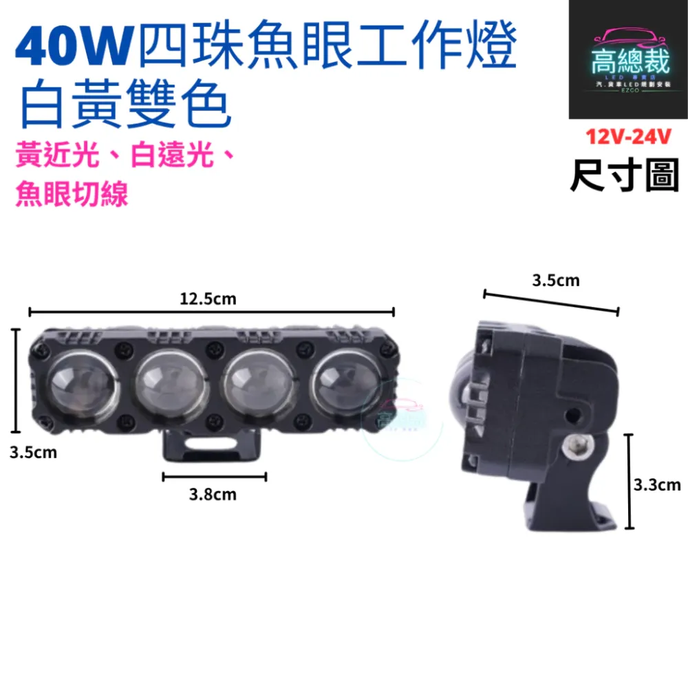 • 【高總裁LED 】台灣現貨 40W四珠魚眼切線 工作燈 白光 黃光 白黃雙色 12V~24V 防水工作燈 超亮 霧燈
