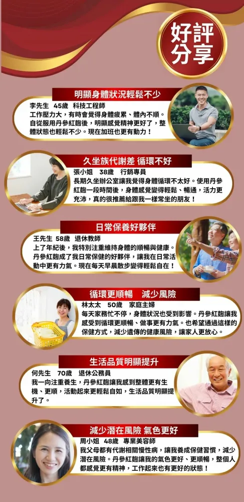 成分:丹參萃取物、紅麴萃取物、三七萃取物、靈芝萃取物、薑黃萃取物、葛根萃取物