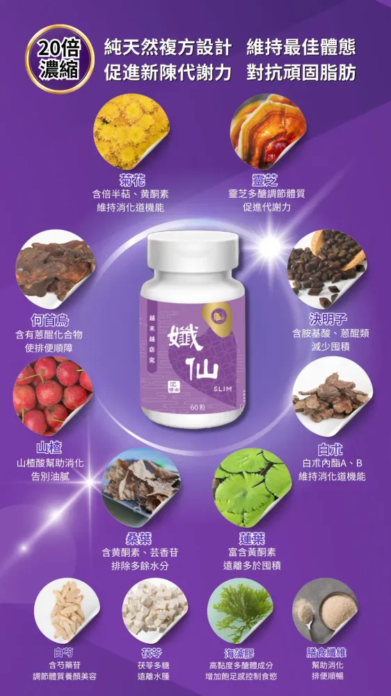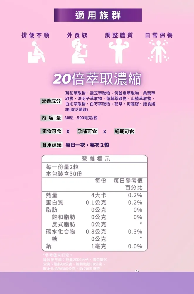 成分:菊花萃取物、靈芝萃取物、何首烏萃取物、桑葉萃取物、決明子萃取物、蓮葉萃取物、山楂萃取物、白朮萃取物、白芍萃取物、茯苓、海藻膠、膳食纖維(靈芝纖維)