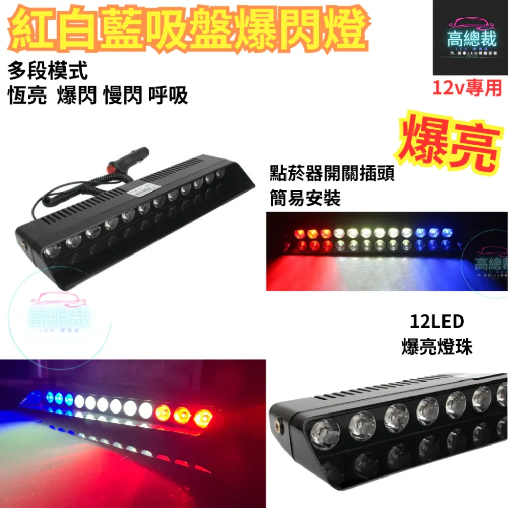 • 【高總裁LED 】台灣現貨 紅白藍吸盤爆閃燈 16段模式 12V 室內燈 吸盤 cob晶片 警示燈 爆閃燈 點菸器插頭