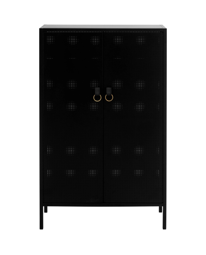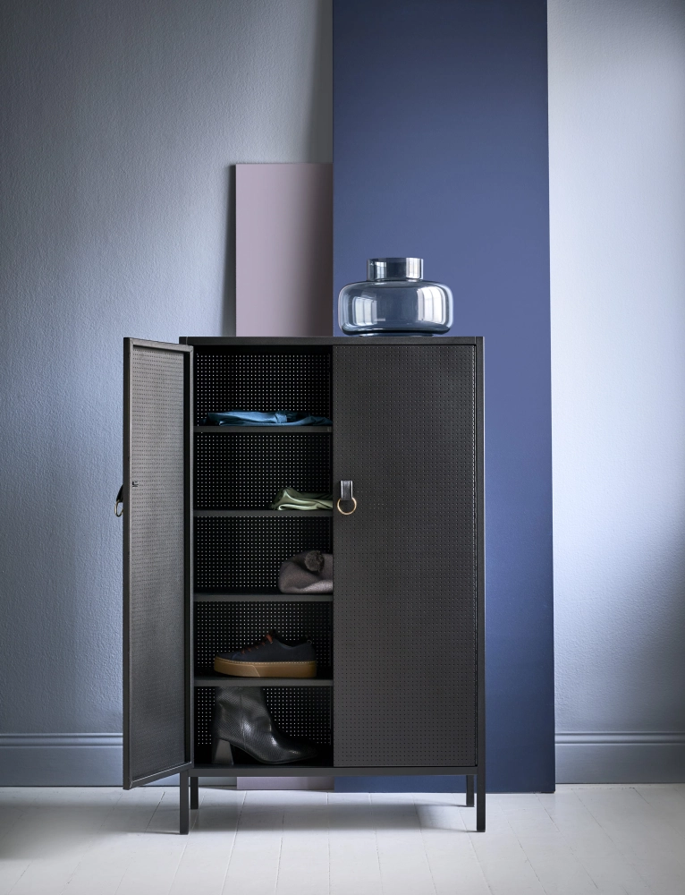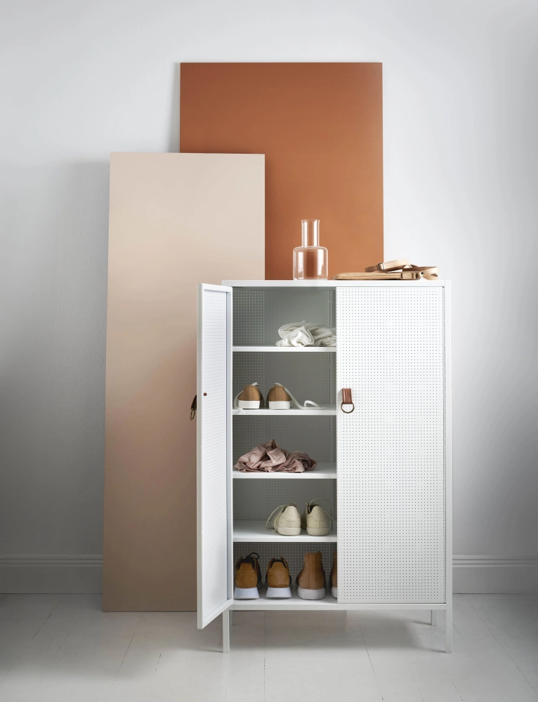 Francis 是一款在瑞典森林中手工焊接而成的收納櫃,採用精細穿孔的粉末塗層金屬製作,展現出俐落且具通透感的幾何視覺。櫃門點綴以瑞典百年皮革名家 Elmo 的高級皮革門把手,賦予工業材質溫潤的手感。