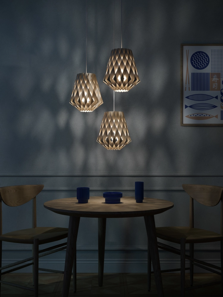 設計師 Tuukka Halonen 透過天然且永續的樺木膠合板,將自然的氣息帶入室內。無論是單盞點亮或個性化組合,都能在大空間中營造出北歐設計特有的溫暖與幸福感。