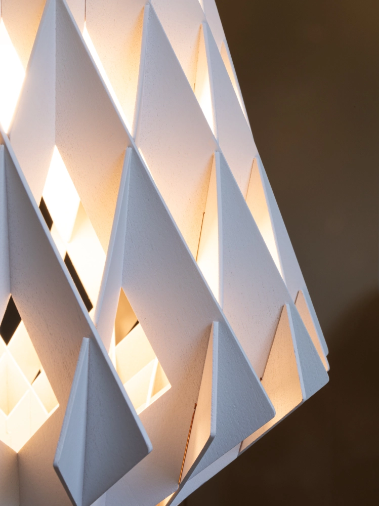 Pilke 28 的松果形設計源自芬蘭傳統瓦片工藝與現代科技的完美結合。無需使用任何膠水或螺絲,由職人手工組裝而成,從每個角度觀看都展現迷人的幾何美感。