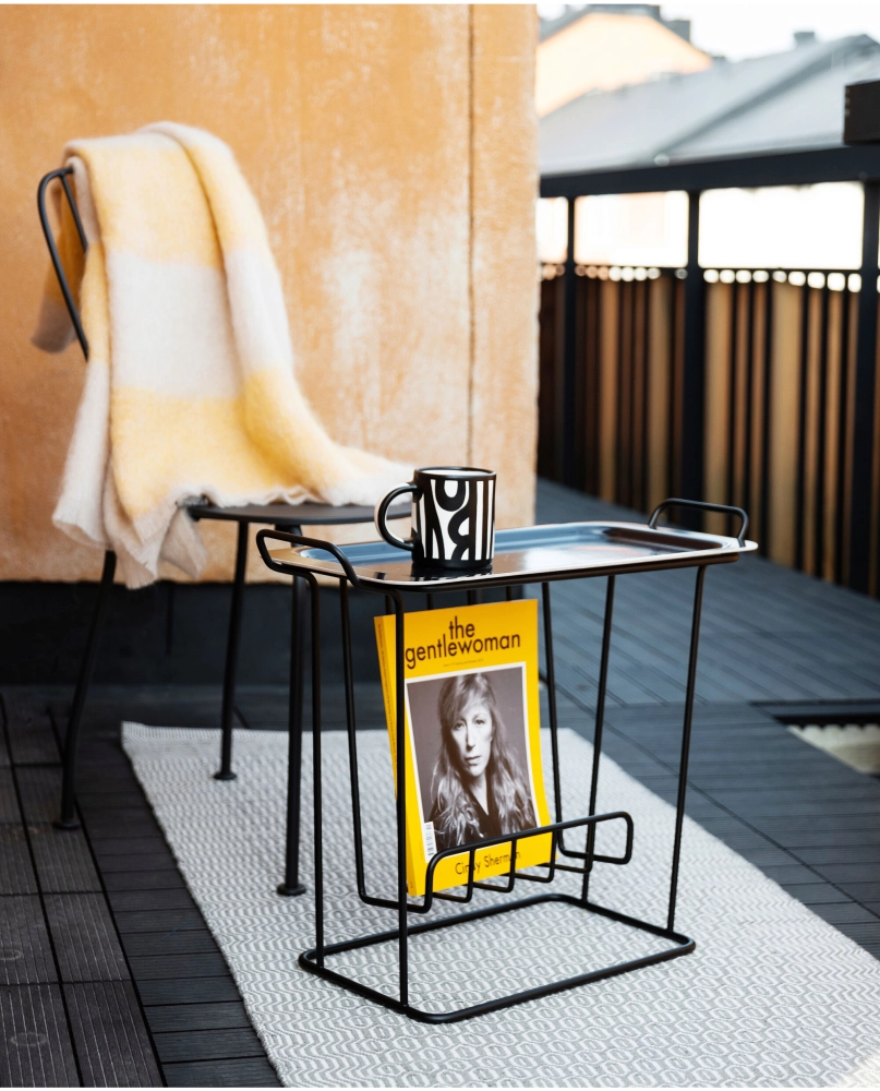 托盤安置於由 100% 回收鋼絲製成的穩固框架上,簡潔的幾何結構中隱藏了實用的報架空間,為您的雜誌與報紙提供優雅的收納歸處。