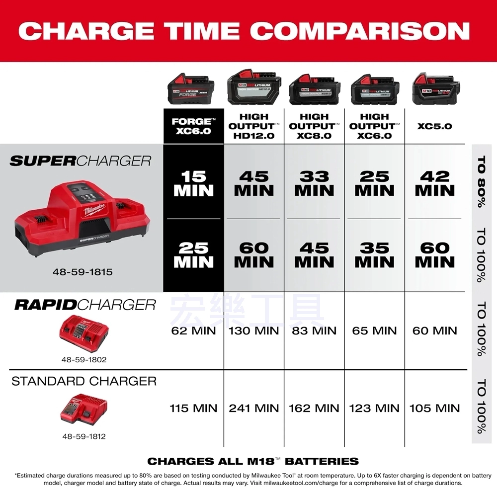 使用M18™雙槽超級充電器35 分鐘超級充電至 80% ,45 分鐘即可充滿電