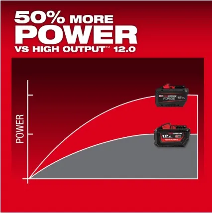 比M18™ HIGH OUTPUT™ 12.0 Ah 電池提供高達 50% 的電量