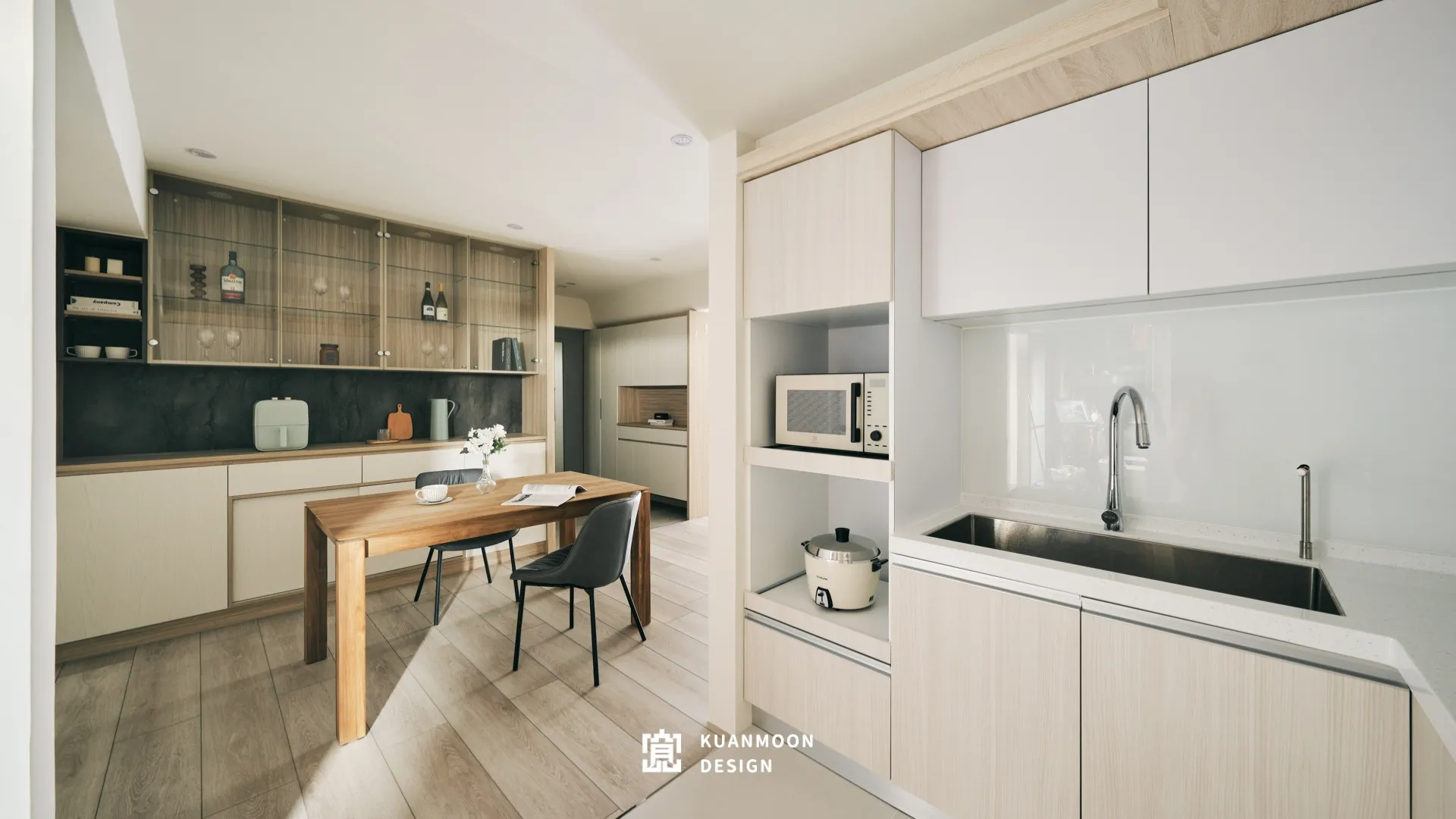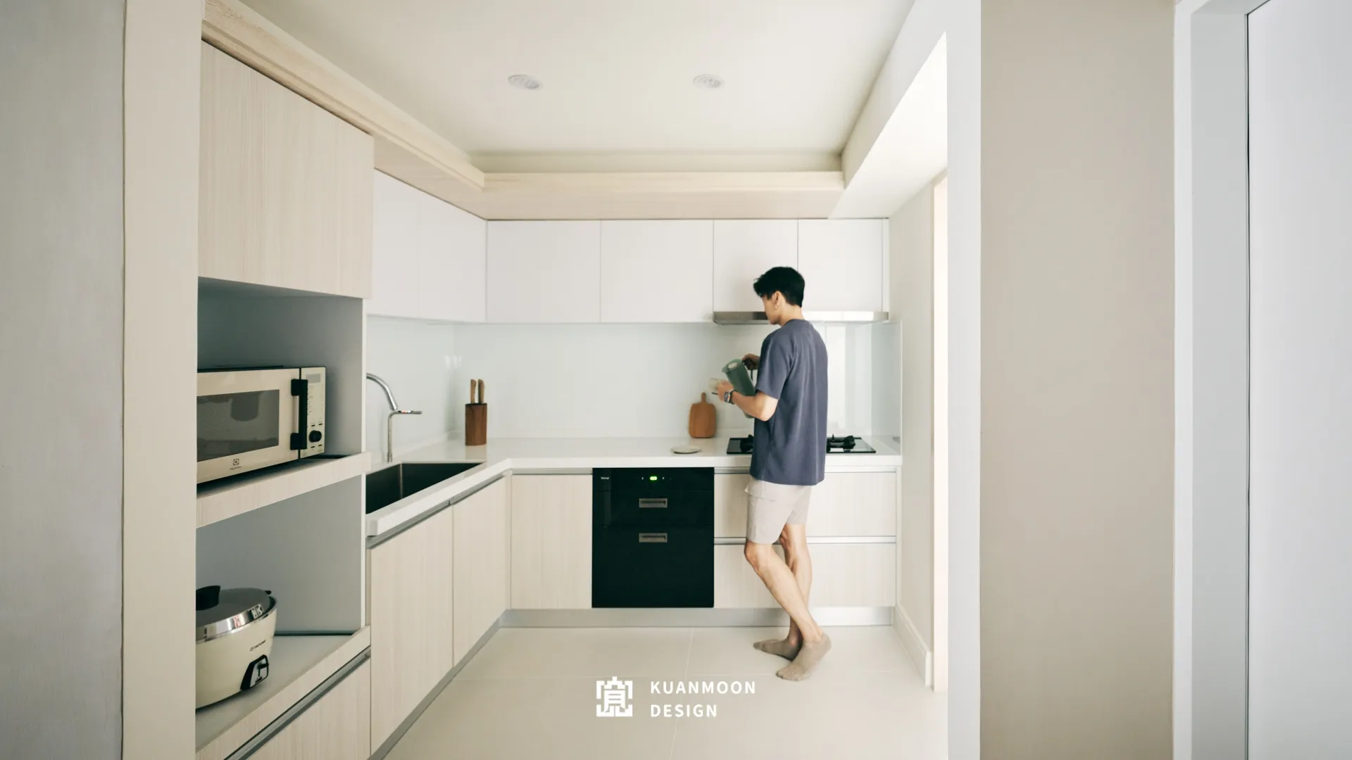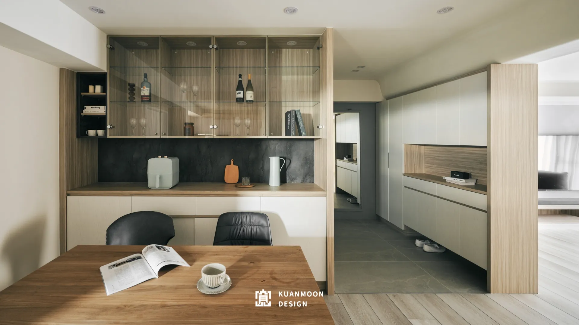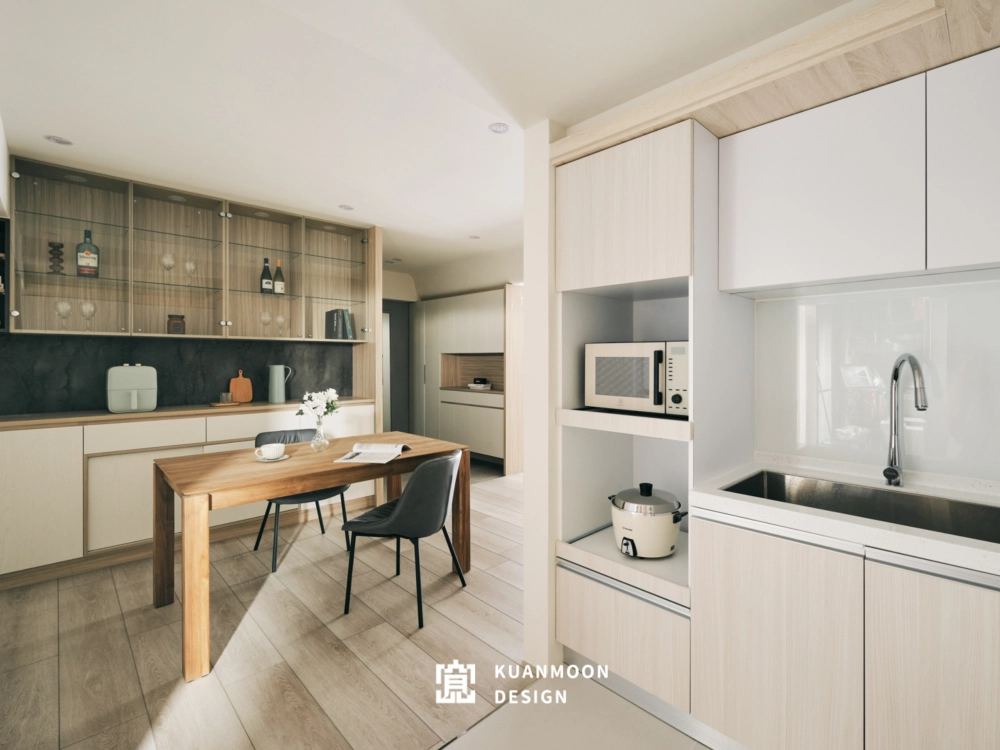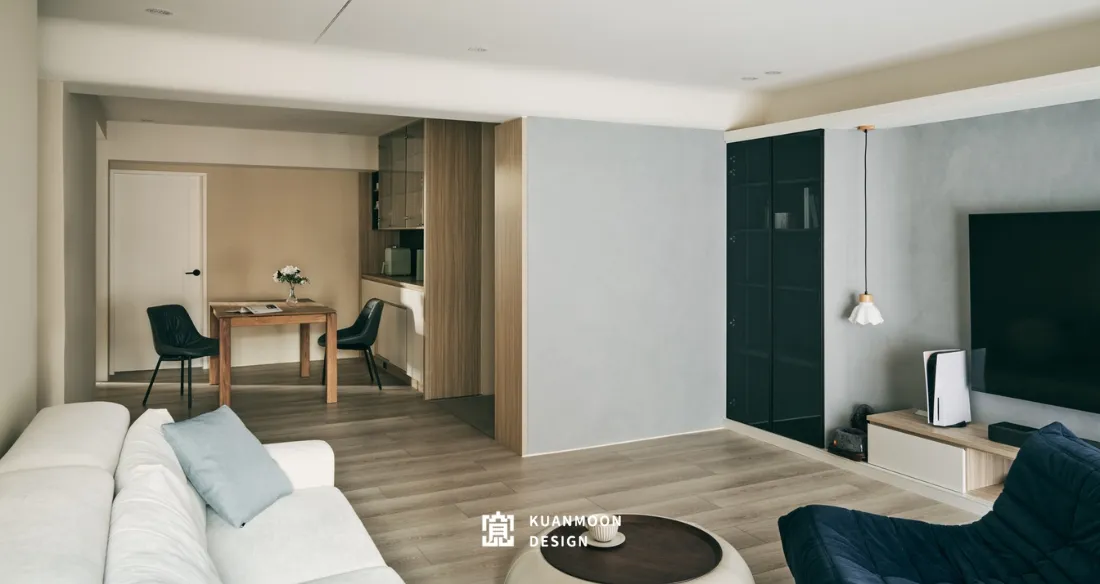 踏進門就能感受到溫馨、柔和的氛圍,整體空間顏色的選配上採用奶茶色系,再搭配木紋以及清水模塗料,營造出平靜舒適的居住環境。忙碌了一整天後,回到家好放鬆,給人一種安定信心的感覺。