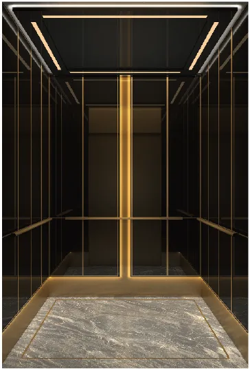天花板:黑鈦鏡面不銹鋼,壓克力燈飾,暗藏燈帶 後側壁板:黑鈦鏡面不銹鋼,香檳金髮紋,金屬裝飾條,暗藏燈帶 兩側壁板:黑鈦鏡面不銹鋼,香檳金髮紋,金屬裝飾條,暗藏燈帶 扶手:香檳金不銹鋼圓管扶手 地 板:PVC/大理石
