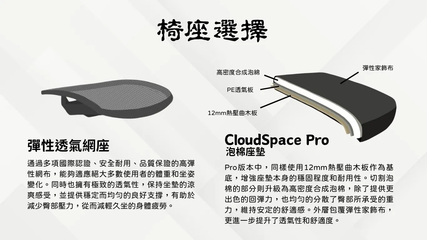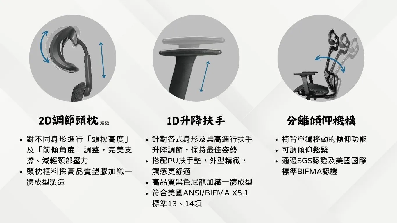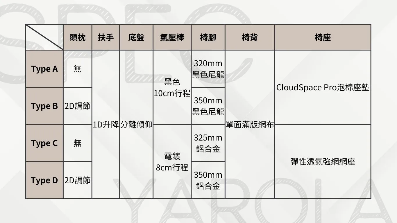 <頭枕> 無頭枕 / 2D調節頭枕(升降、角度) <扶手> 1D升降扶手 <腰靠> 固定式腰靠 <底盤> 分離傾仰機構 <椅座材質> CloudSpace Ultra 泡棉座墊 / 彈性透氣網座 <特色> 基礎背框增添Y字結構 外觀簡約且更有支撐力 背框增添銀色修飾版 低調卻不單調