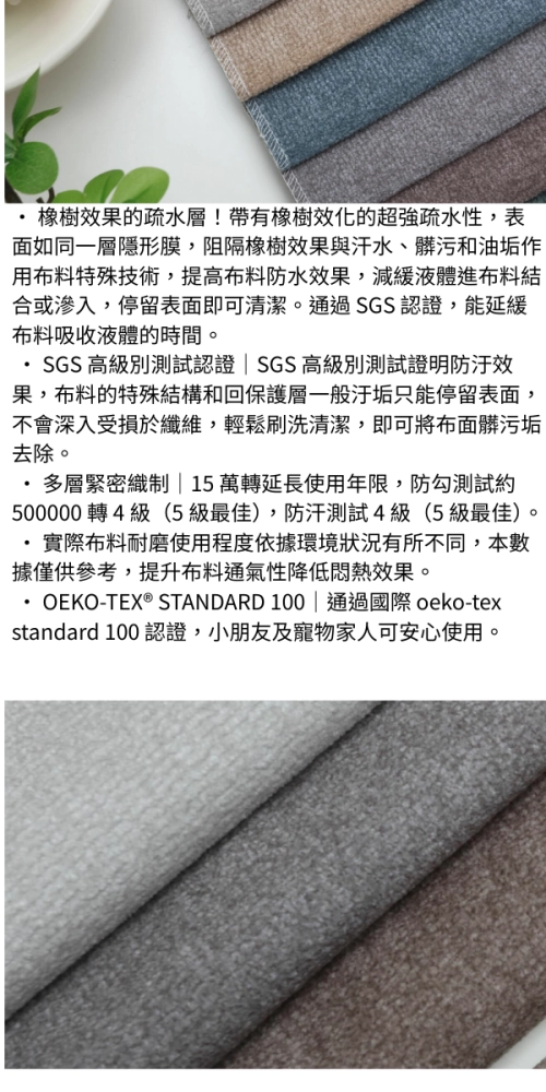 • SGS 高級別測試認證|SGS 高級別測試證明防汙效果,布料的特殊結構和回保護層一般汙垢只能停留表面,不會深入受損於纖維,輕鬆刷洗清潔,即可將布面髒污垢去除。