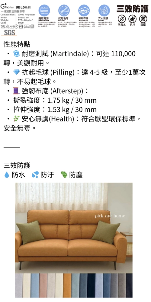 • 🌀 耐磨測試 (Martindale):可達 110,000 轉,美觀耐用。