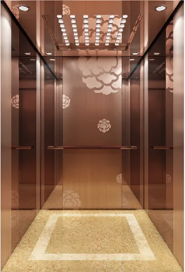 天花板:玫瑰金鏡面不銹鋼,壓克力燈飾,LED嵌燈 後側壁板:玫瑰金鏡面不銹鋼,玫瑰金髮紋蝕刻不銹鋼 兩側壁板:玫瑰金鏡面不銹鋼,玫瑰金髮紋不銹鋼 扶手:玫瑰金和圓木組合扶手 地 板:PVC/大理石