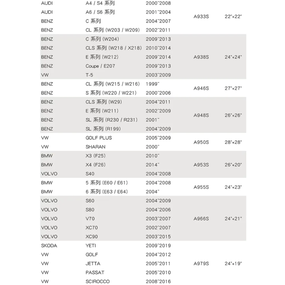 尺寸:28吋(700 mm) + 26吋 (650 mm) 兩支雨刷一組