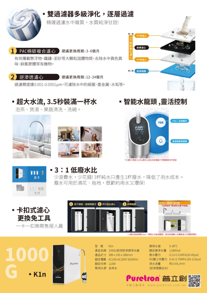 淨水流量:約2.63L/min(逆滲透膜出水)