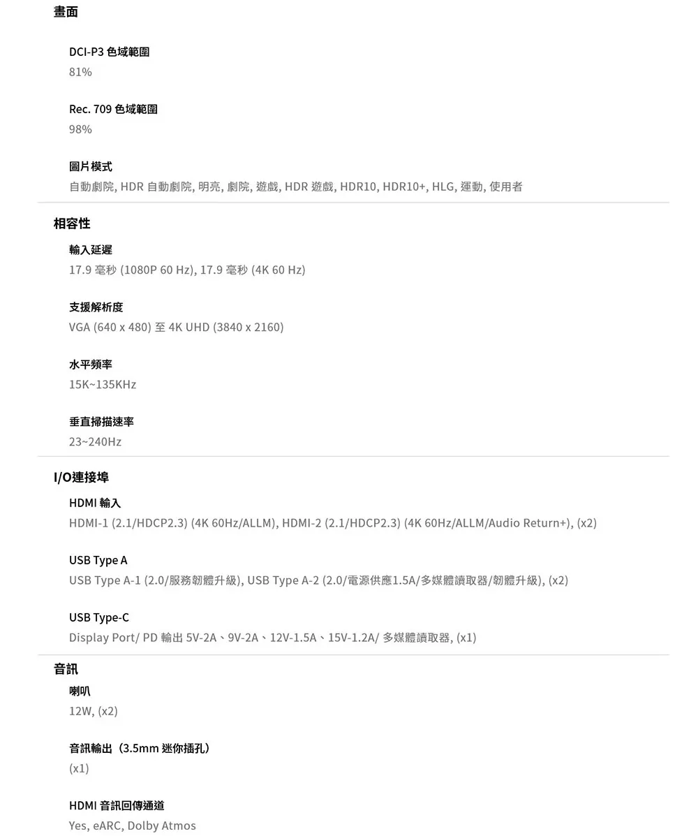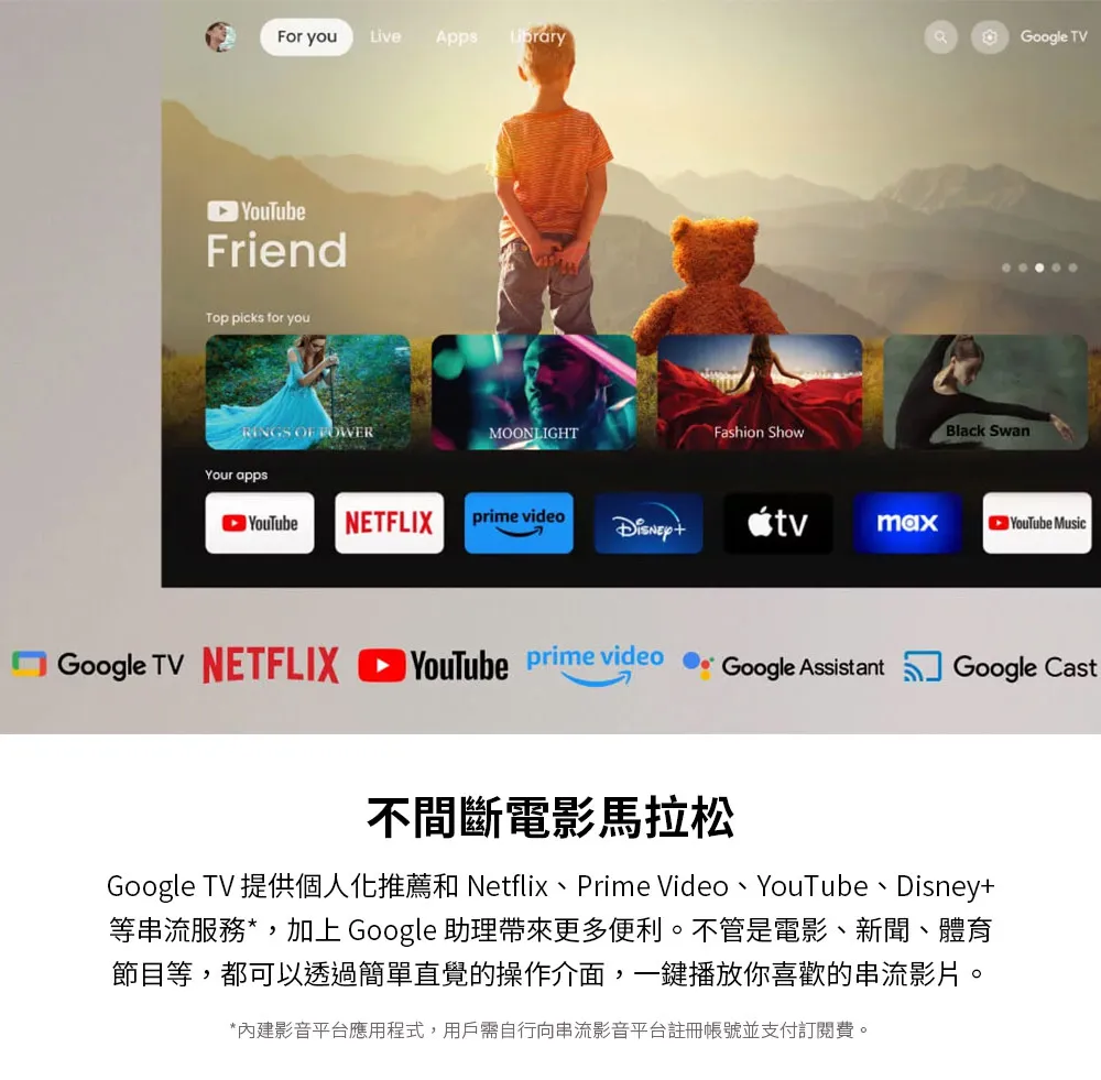 - 觀影 & 遊戲,一機搞定:Google TV 和預載授權 Netflix,搭配 ALLM (自動低延遲模式),玩 4K 遊戲也順暢。