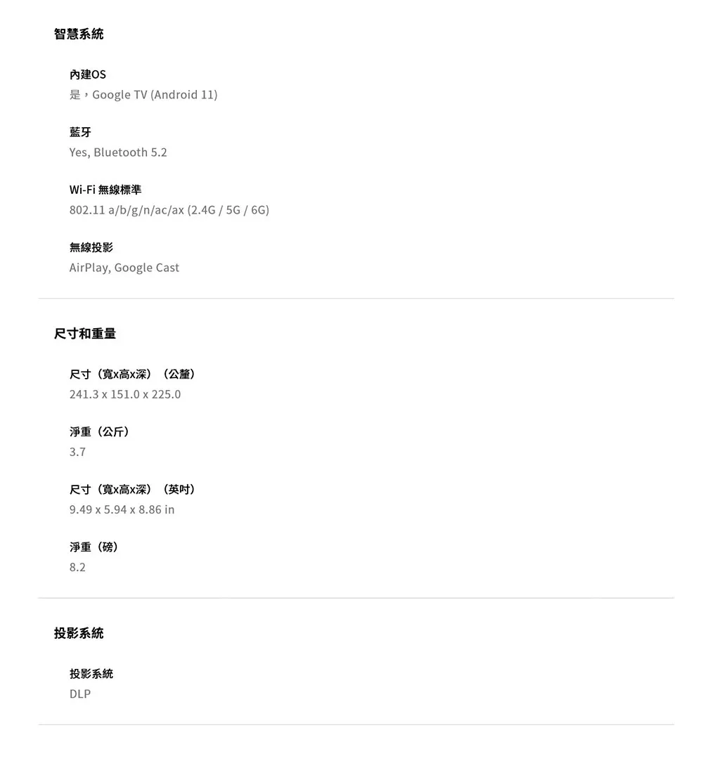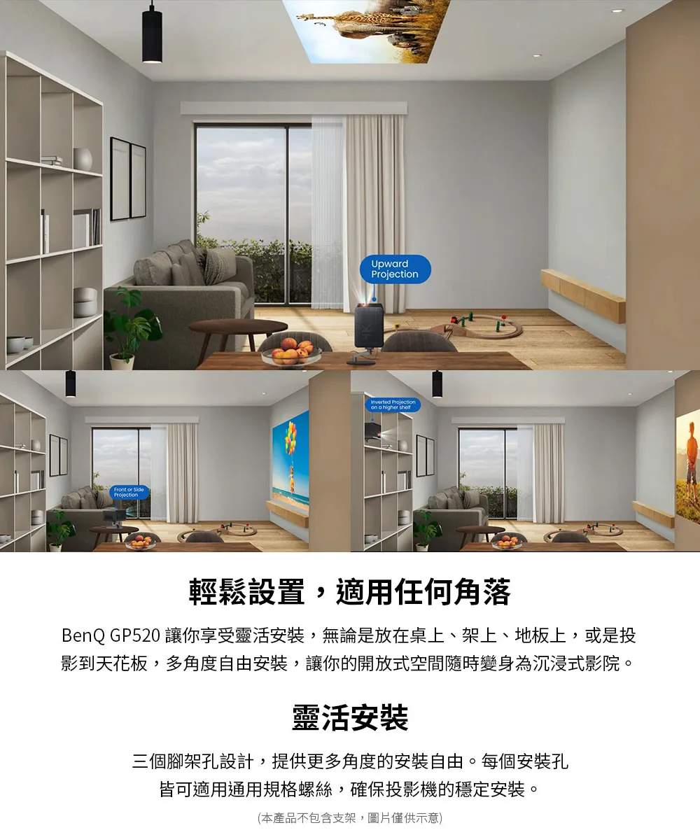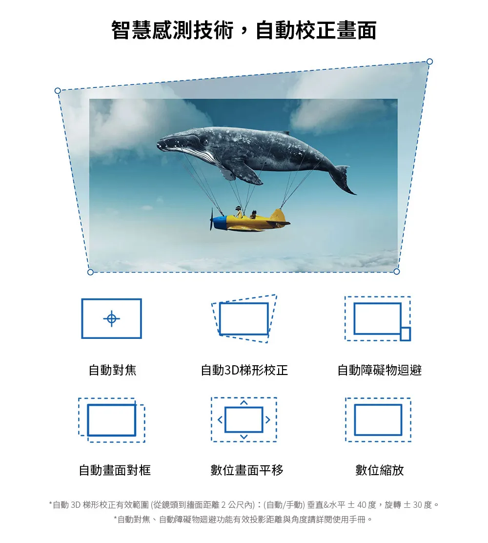 - 四大智慧感測:自動側投影和對焦,輕鬆一擺即是方正大畫面。