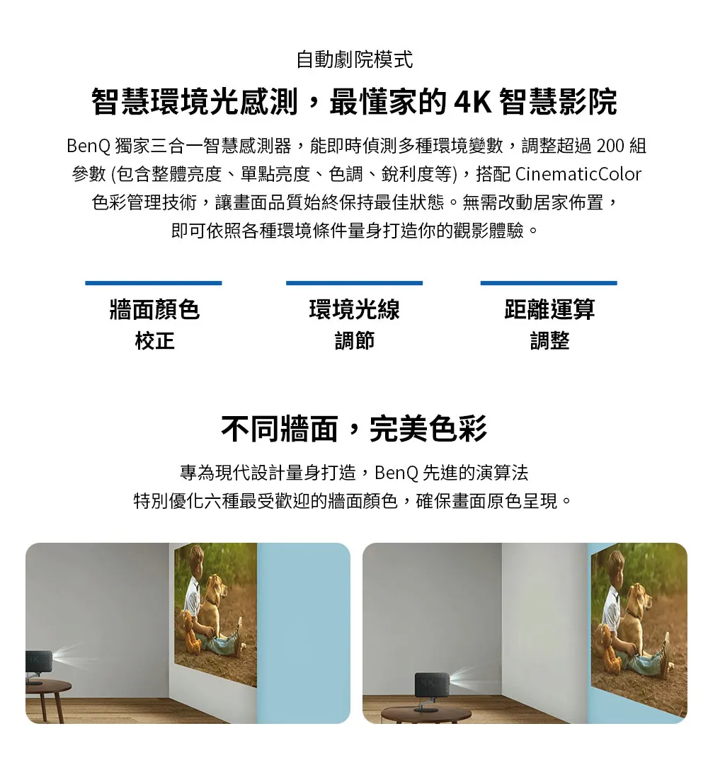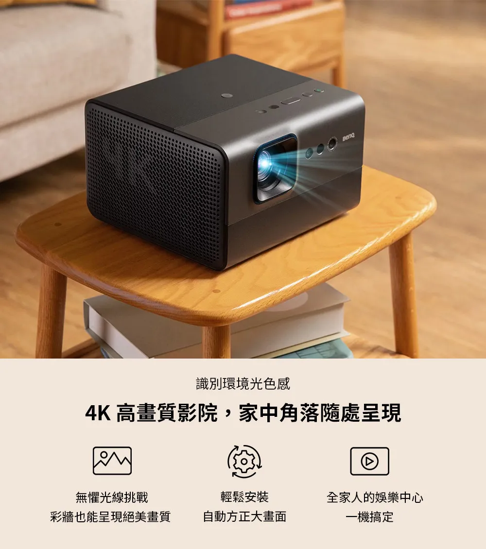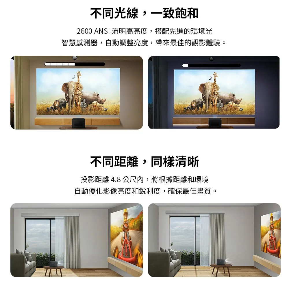 - 2600 ANSI 高亮度,搭配智慧環境光感測,自動運算光線/牆色/距離,家中每個角落都是絕佳 4K 劇院。
