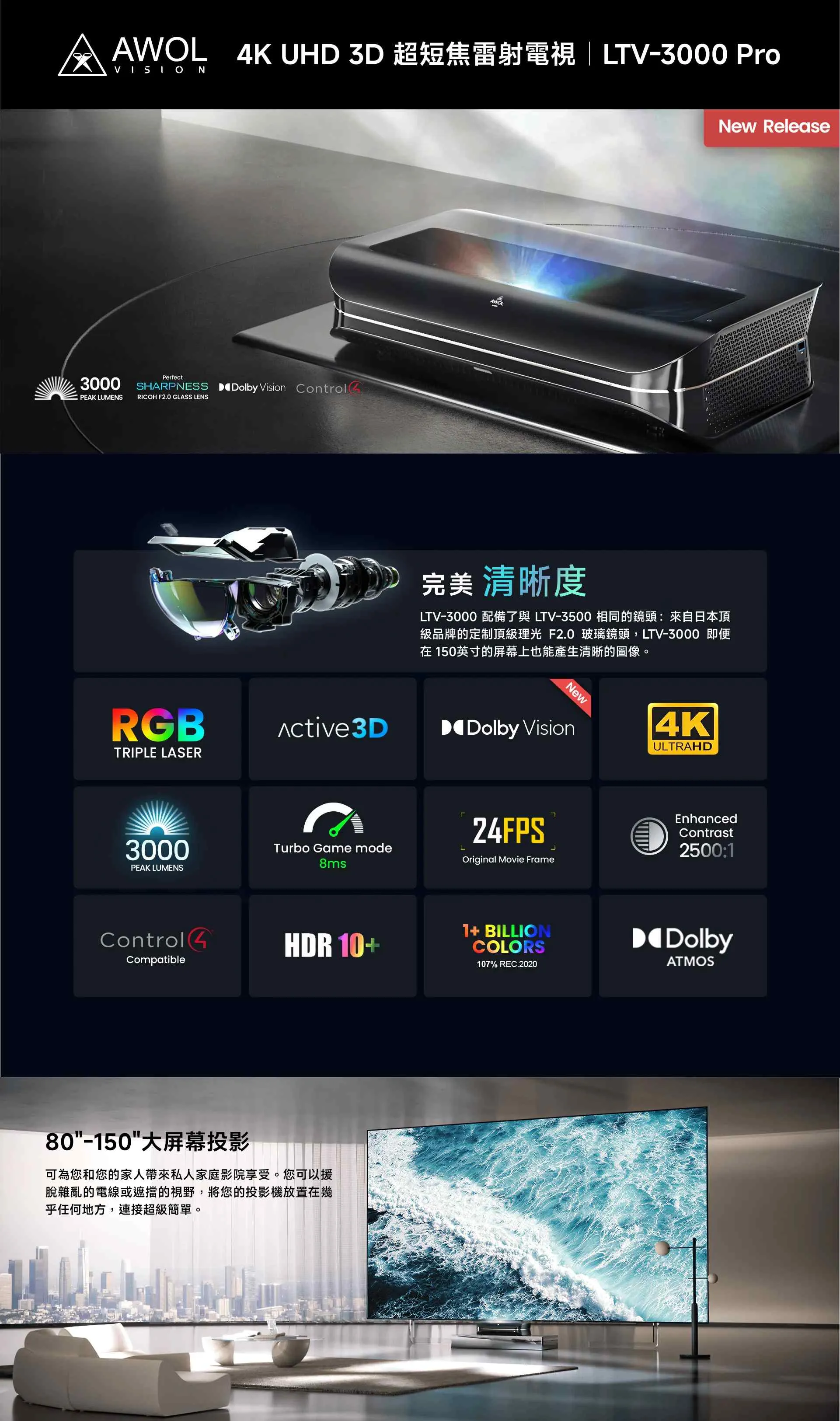 頂級高階旗艦4K短焦雷射投影機- 純3色雷射光源LTV-3000 Pro ,主要亮點107% Top REC 2020 色域, 支援Dolby Atmos音效及eARC輸入, 體驗高規格沉浸式並專屬您的劇院投影機 !