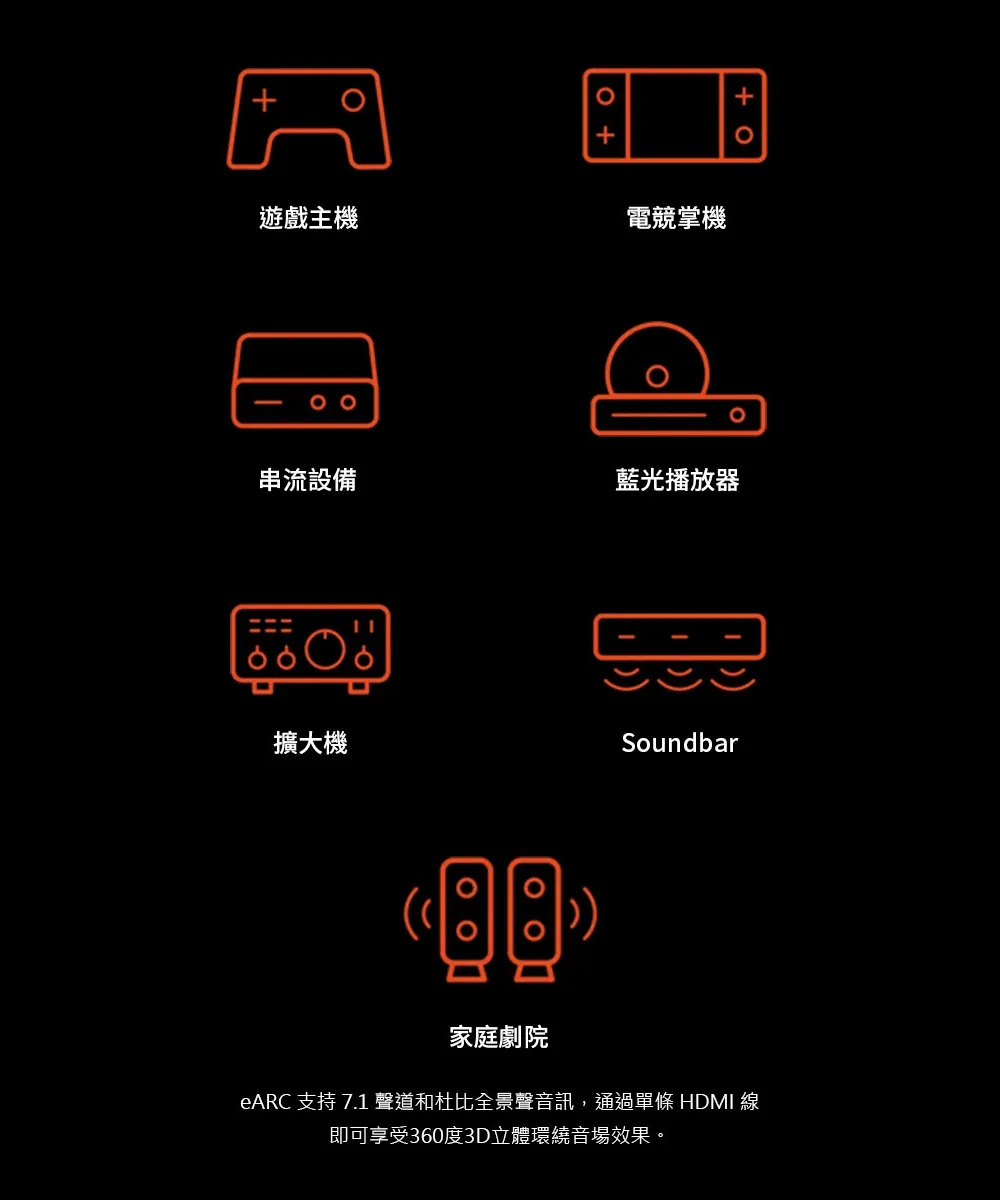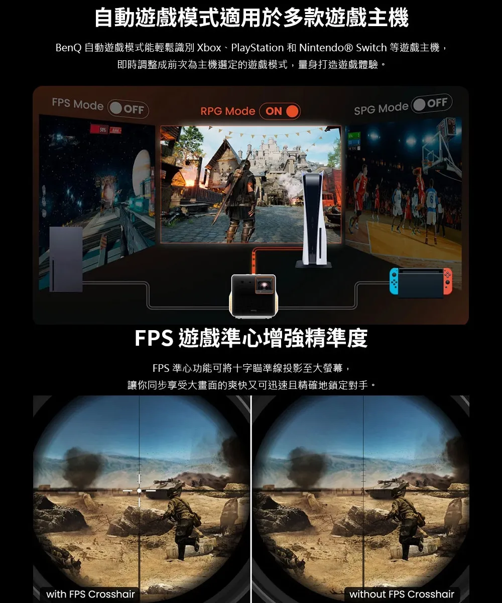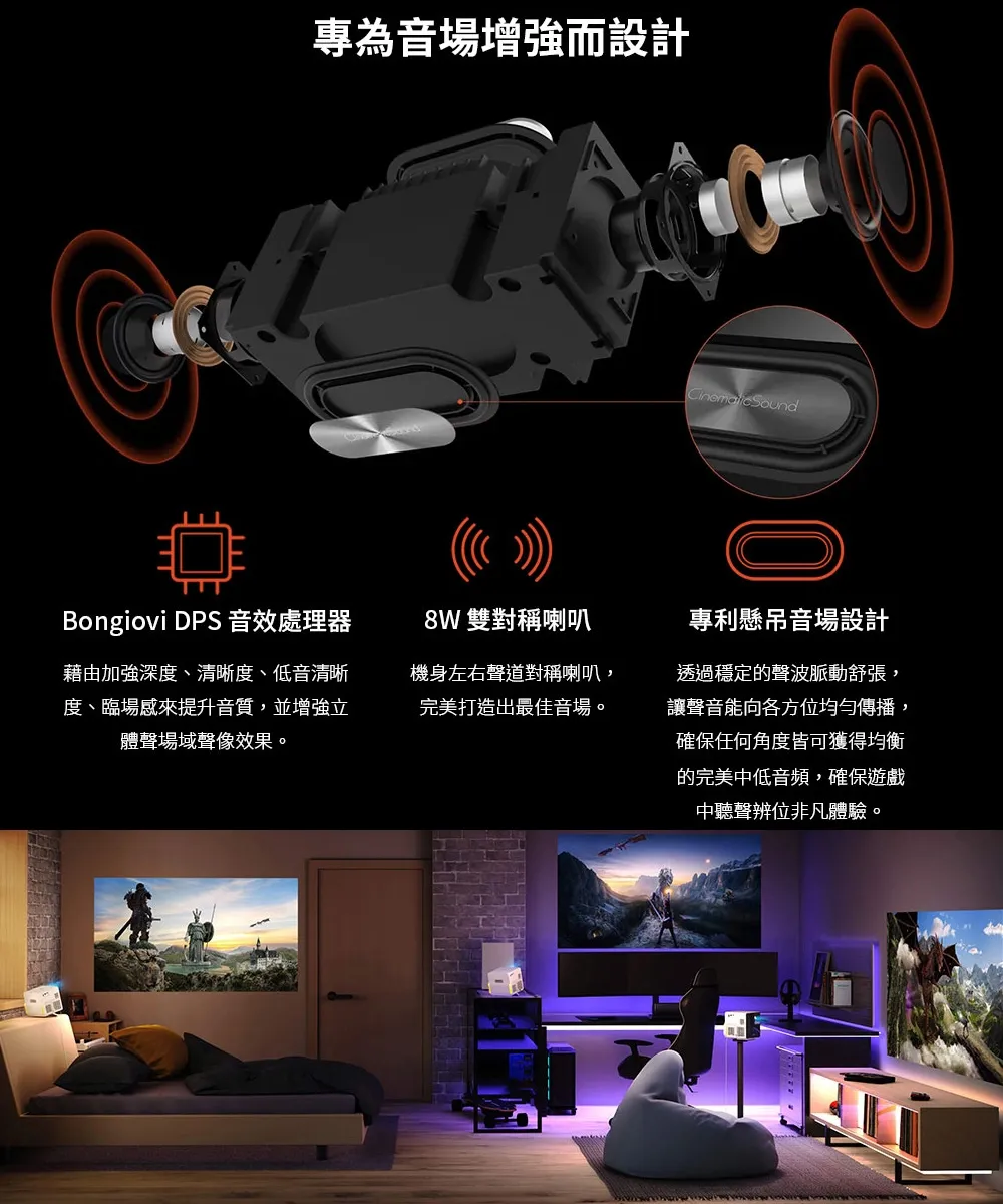 - 8W 雙對稱喇叭搭載懸吊音場設計,加上 BenQ CinematicSound 聲音調校技術,精準呈現遊戲空間音效