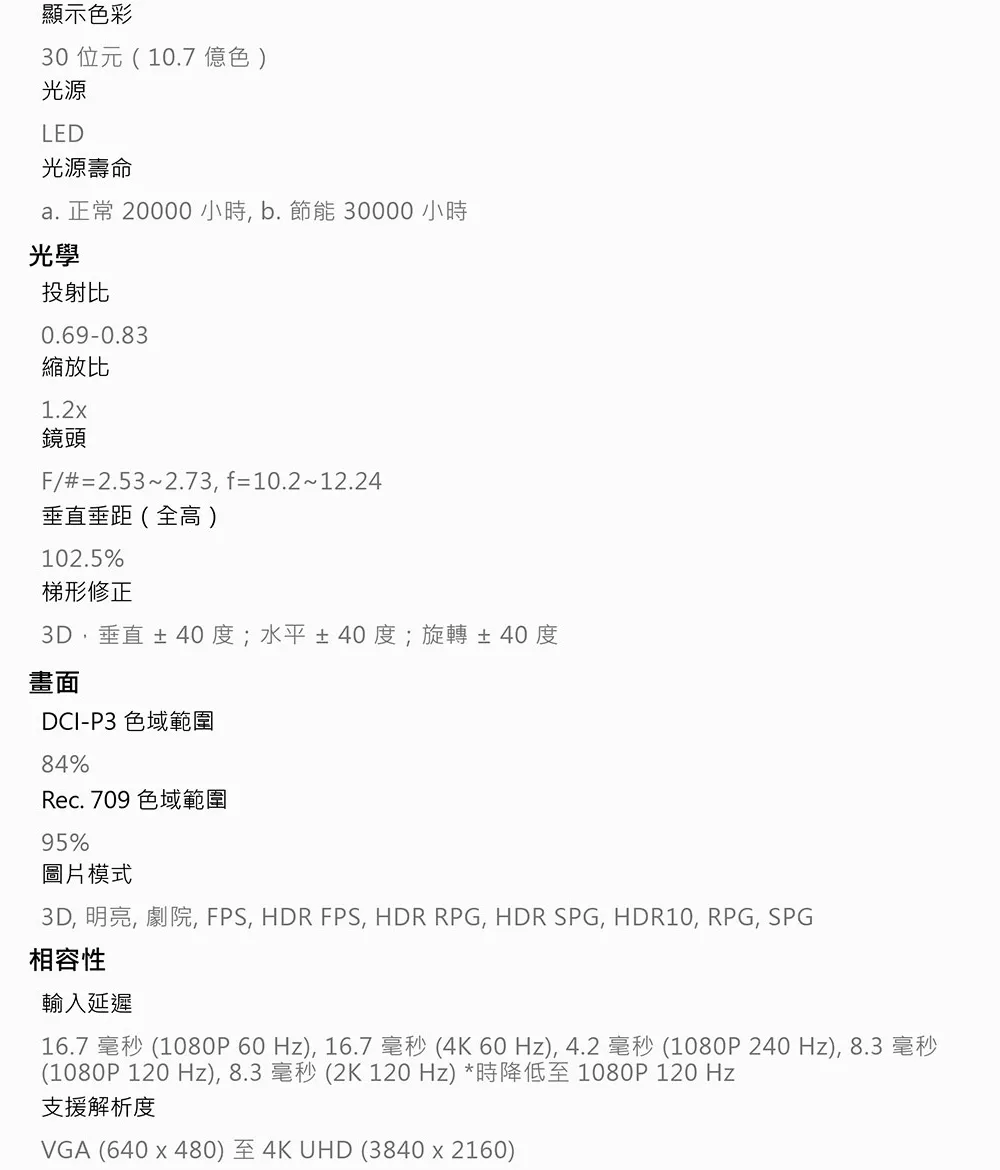 - 2000 ANSI 流明,84% DCI-P3 色域覆蓋率和HDR-PRO™ 技術,亮暗細節更清晰