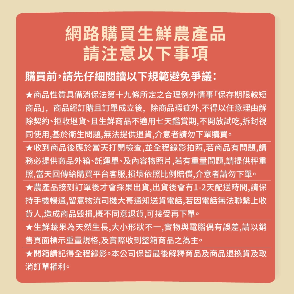(1)商品性質具備消保法第十九條所定之合理例外情事「保存期限較短商品」, 商品經訂購且訂單成立後, 除商品瑕疵外,不得以任意理由解除契約、拒收退貨、且生鮮商品不適用七天鑑賞期,不開放試吃,拆封視同使用,基於衛生問題,無法提供退貨,介意者請勿下單購買。