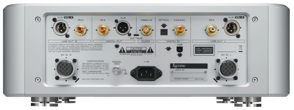 型號搭載的「Master Sound Discrete Clock for Digital Player」將這個離散電路設計概念應用於數位播放器的內建時鐘。這款獨特的電路設計精選了包括大型晶體振盪器在內的離散元件,能夠呈現高品質的聲音,將 Esoteric 的設計理念體現在每一個細節之中,這是通用時脈無法實現的。此外,透過連接外部主時鐘產生器 Grandioso G1X,並將內部電路同步到更精確的 10MHz 時鐘,可以提升音質。