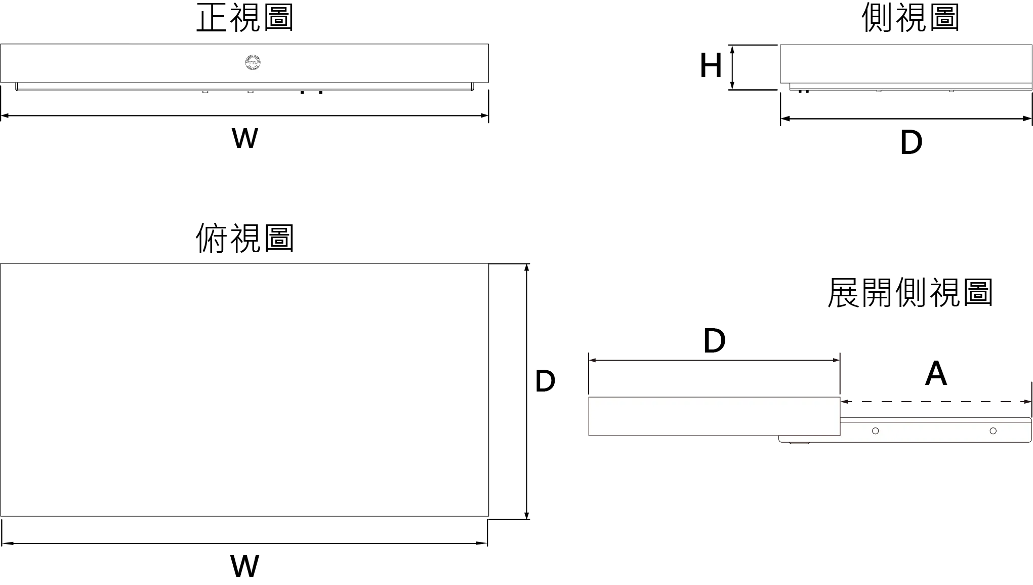 | 型號 | 產品尺寸(mm) W寬xD深xH高 | 可調整範圍A (mm) | 最大負重(kg) | 適合投影機最大尺寸(mm)寬x深x高 | 電壓 v | 產品重量 (kg) |