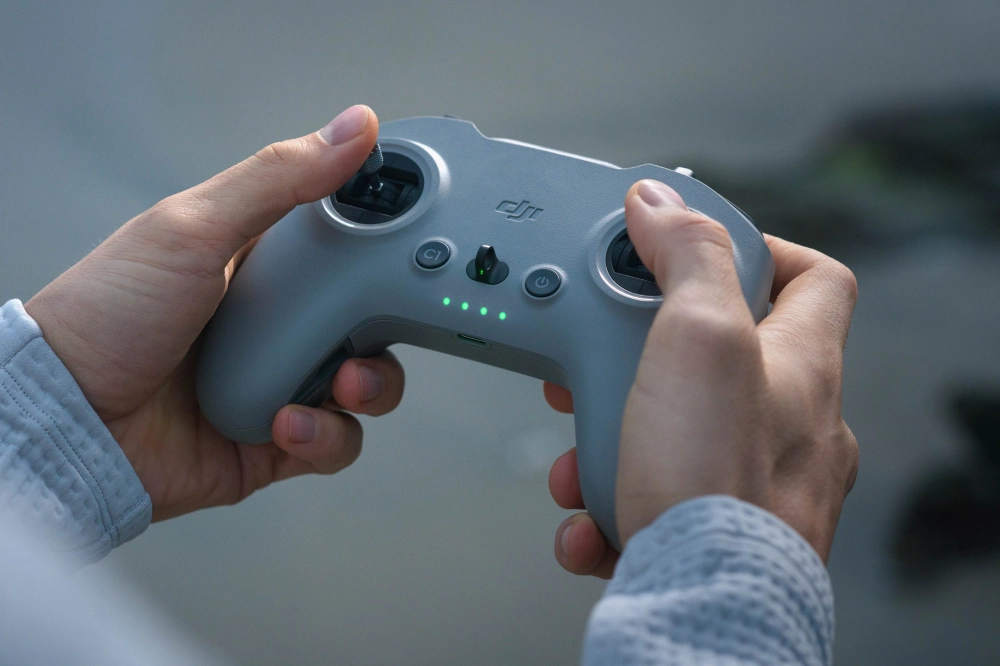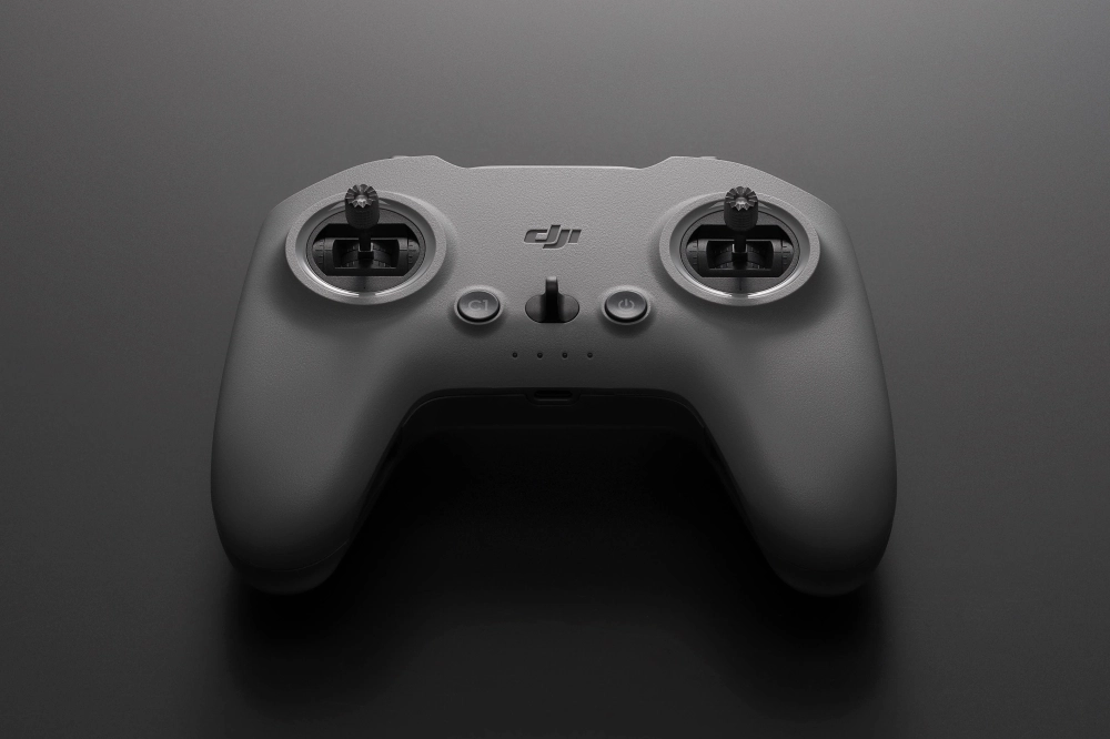 與 DJI O4 影像傳輸相容,內建天線設計,較上一代重量更輕,但續航時間更長;搖桿長度增加 2 公釐,可兼顧單指和雙指操控。