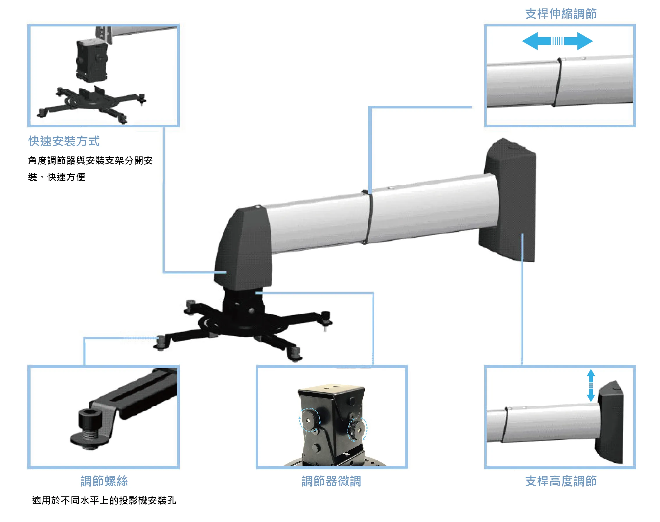 主桿可根據高低需要作伸縮調節,設有高低移動功能,方便對位。