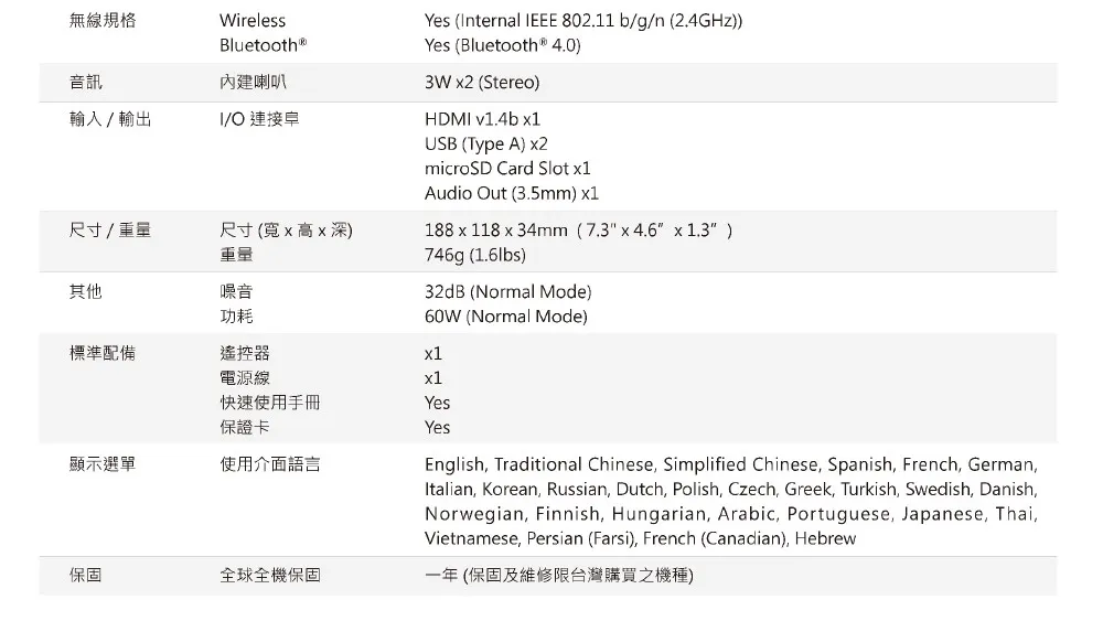 | 傳輸介面 | HDMI v1.4b、音訊輸出 (3.5mm)、USB (Type A) (x2)、microSD 卡插槽 | |
