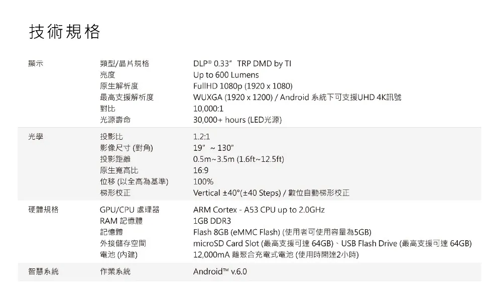 | 畫面投射距離 | 0.5m – 3.5m | |