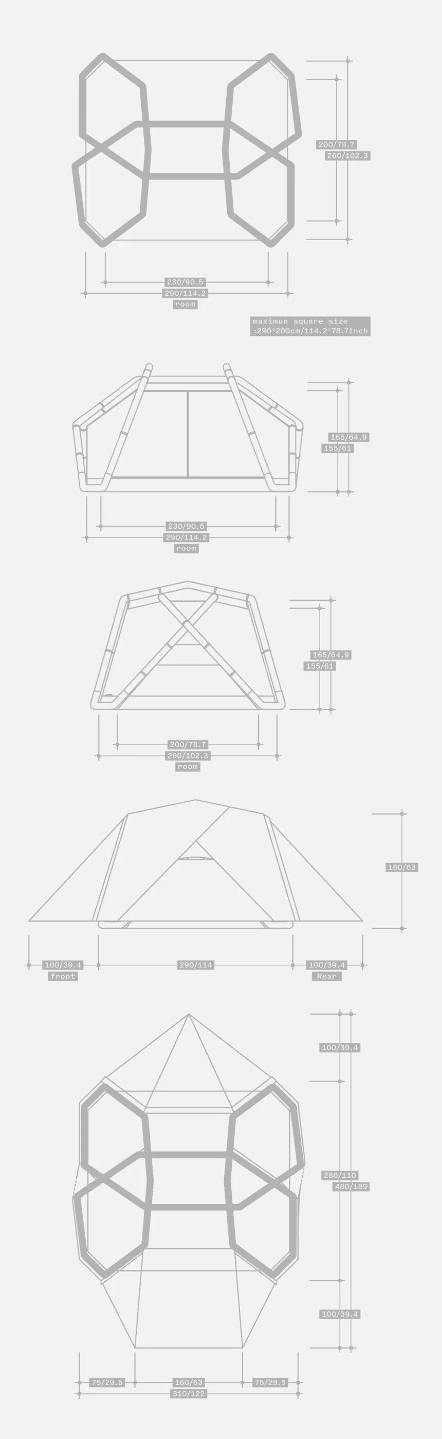 外帳:採用 70D 聚乙烯抗撕裂材質,前門可作為天幕使用,後帳設計可拆卸,並配有 TPU 材質的天窗,增加採光與通風效果。
