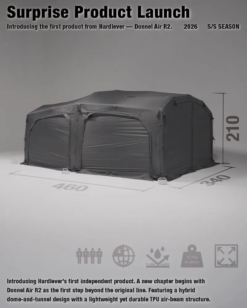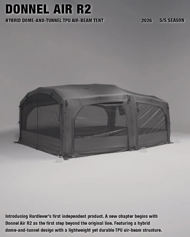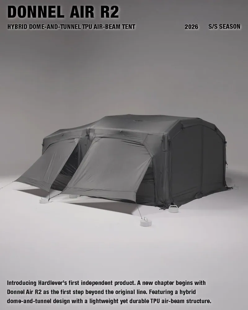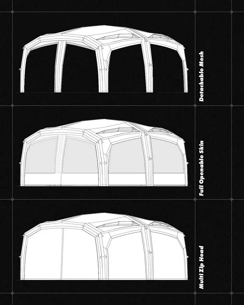 結合圓頂帳的結構穩定性與隧道帳的延展空間優勢,帳體受力平均、抗風性佳,同時提供寬敞且方正的室內使用空間,特別適合中大型營地與家庭露營。