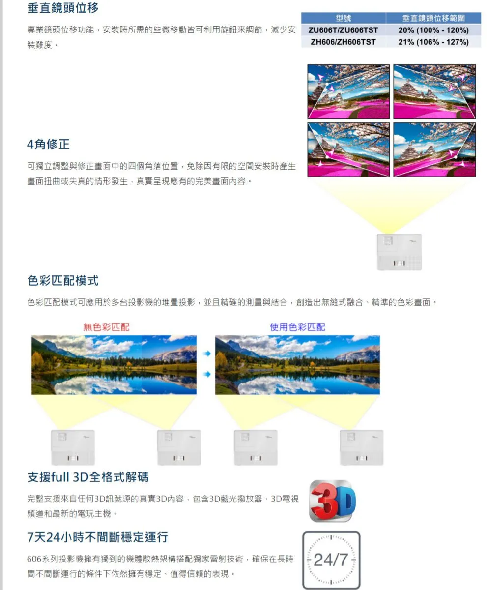 梯形校正±20° 垂直 / ± 20° 水平 / 4角獨立調整