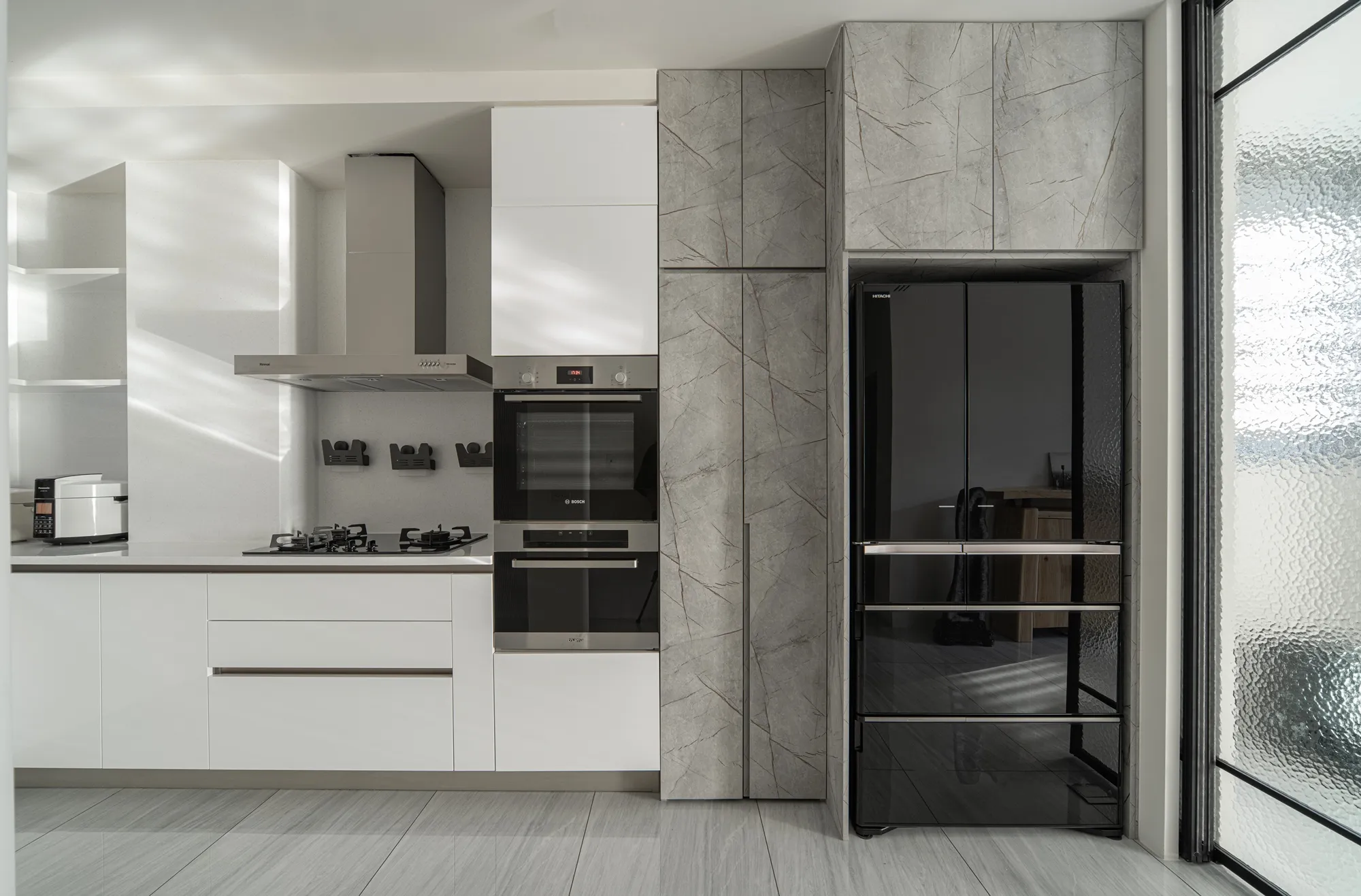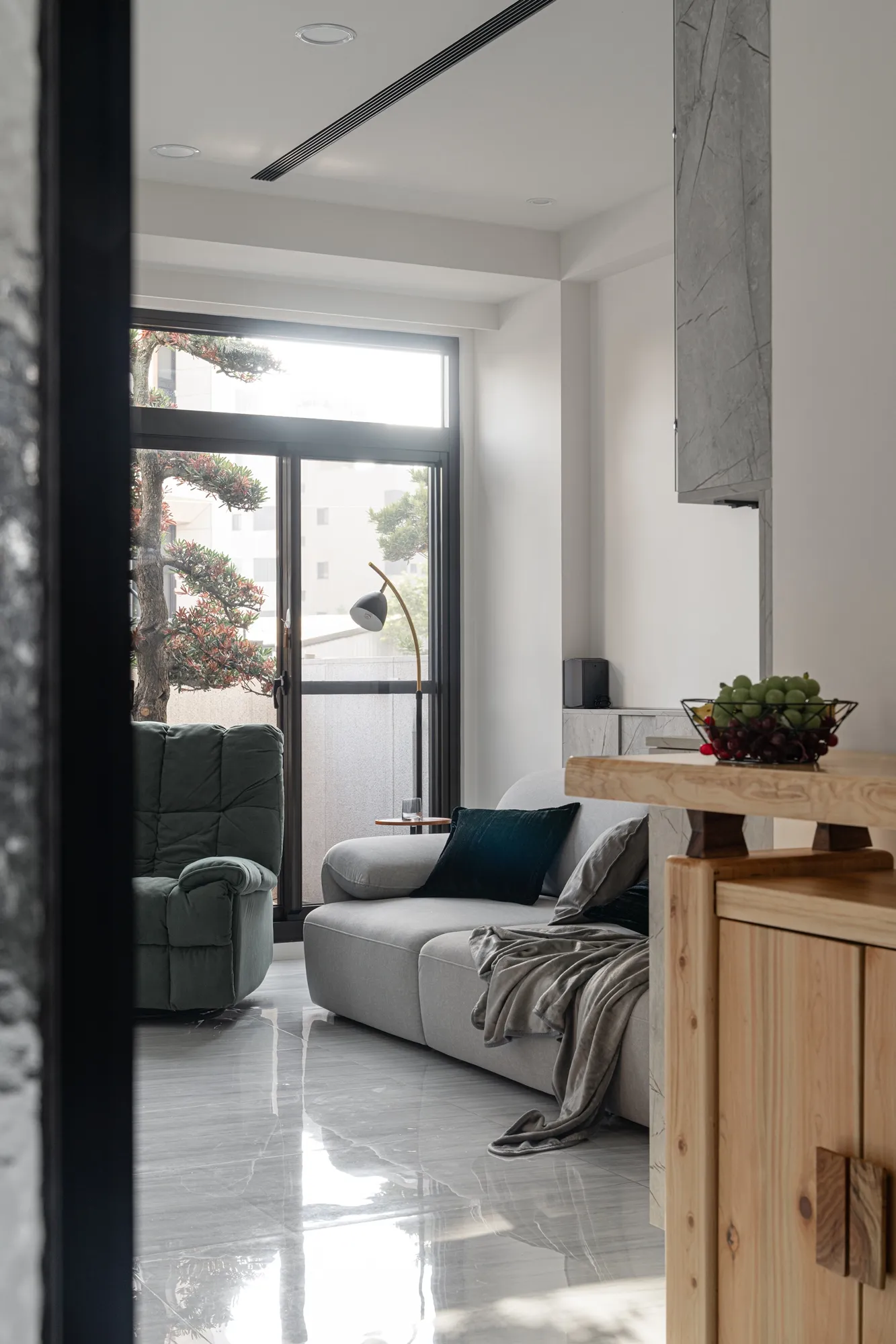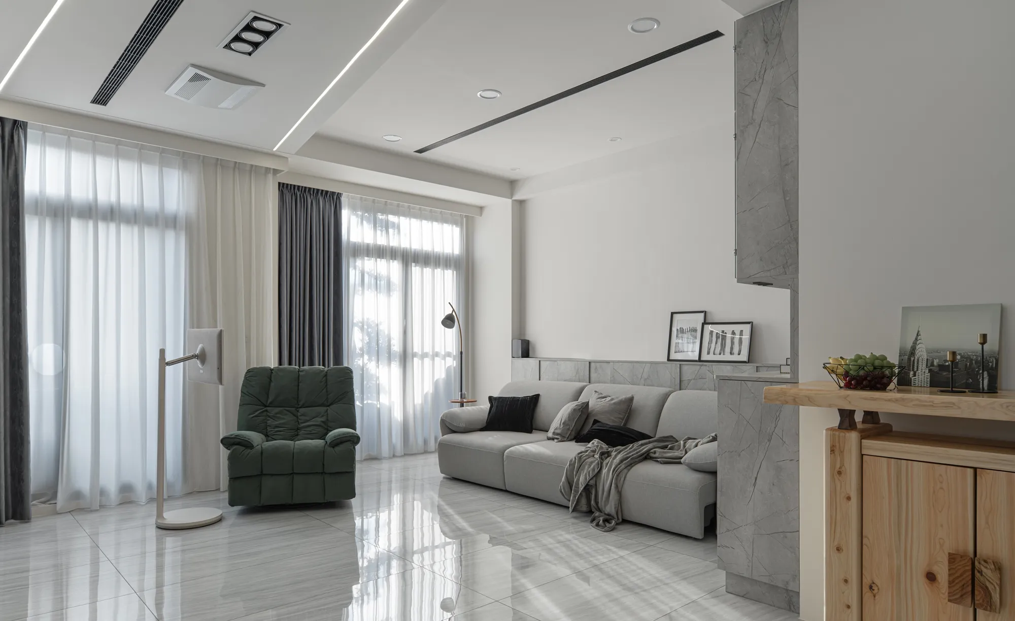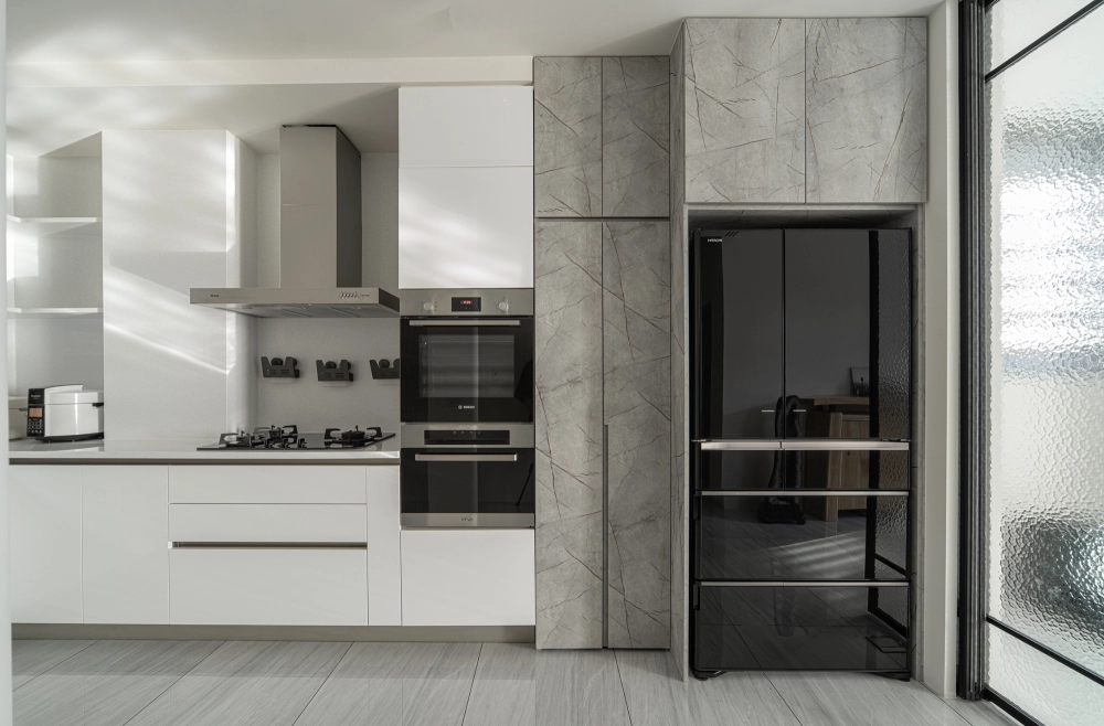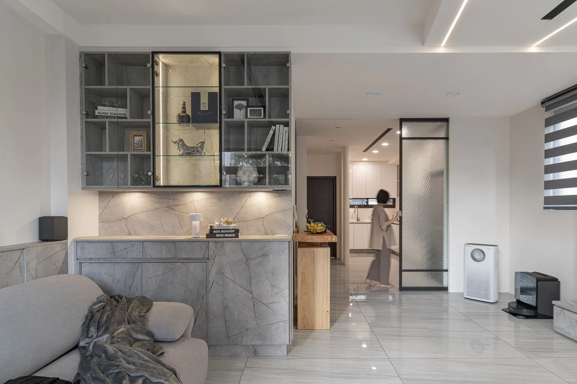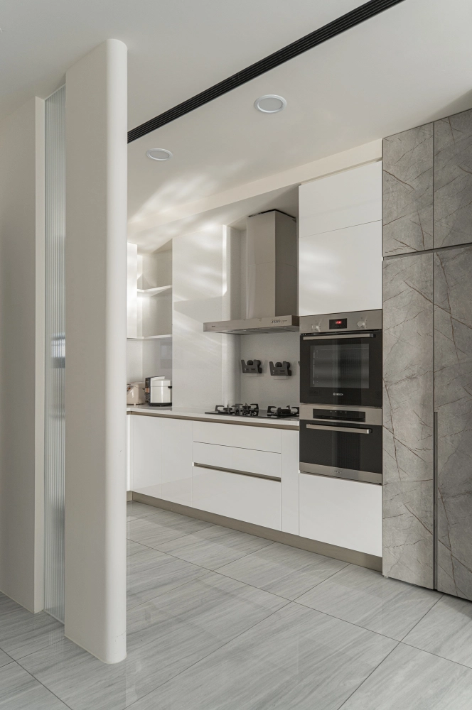 公領域運用玻璃拉門設計區隔客廳與餐廚區域,在保有通透採光的同時,也清楚界定生活機能,讓動線更流暢、空間更具彈性,符合現代家庭對住宅空間規劃的需求。