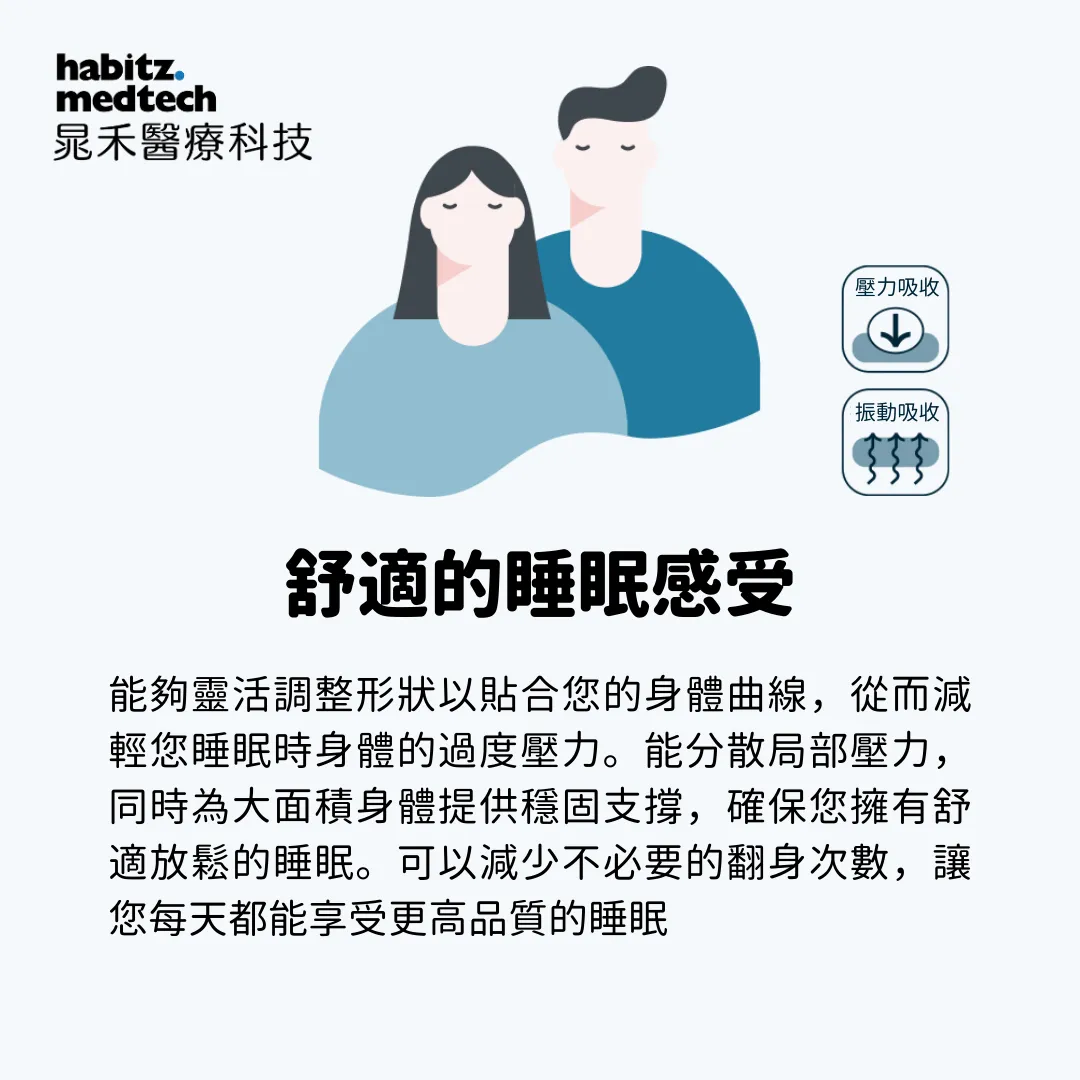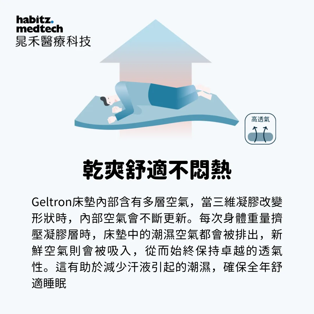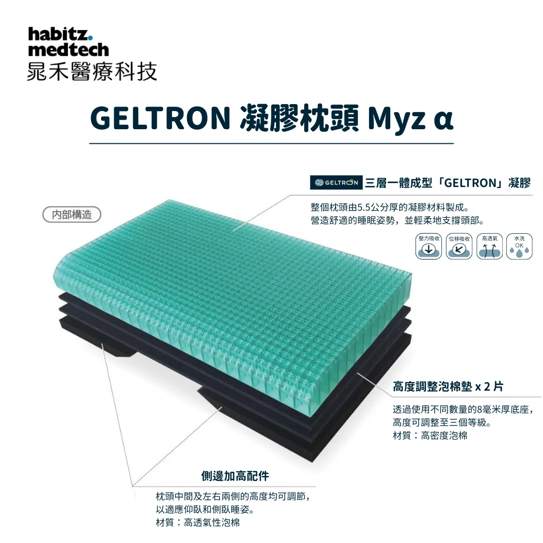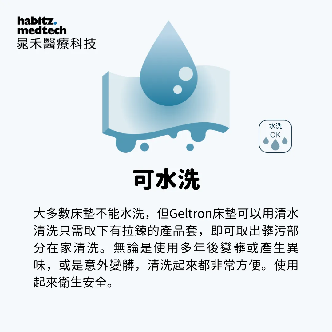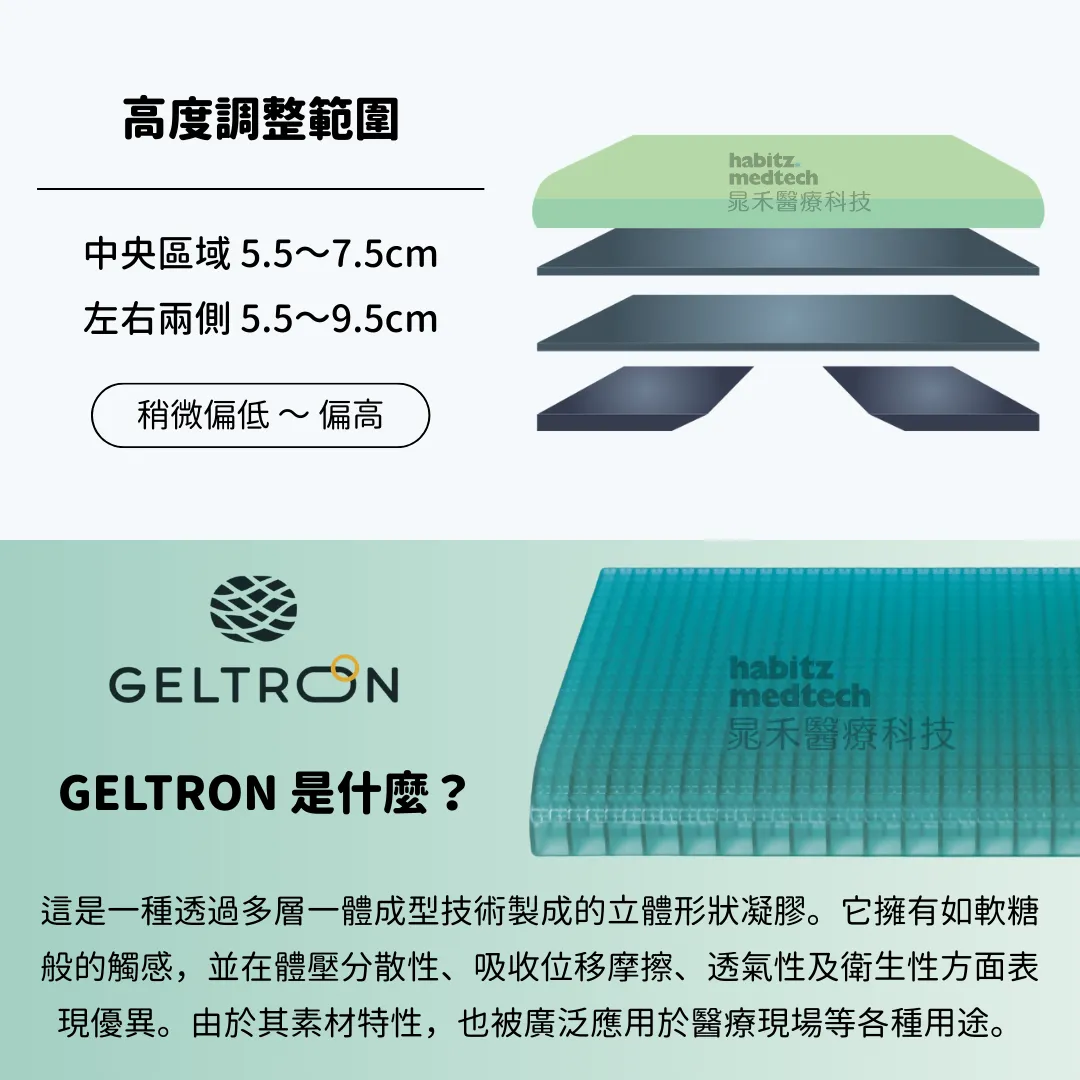 以頭部照護與壓力分散為核心,採用三層一體成型的 GELTRON 固態凝膠結構,能貼合頸椎到頭部曲線,協助維持舒適睡姿,並兼顧仰睡與側睡時對頭部、耳部等部位的承托,降低局部受壓風險;同時具備高度與形狀可調設計,可依需求調整中央與兩側高度,並強調透氣、耐用與易清潔(枕套可水洗、枕體可用水清潔),適合需要較高等級褥瘡(壓瘡)預防與照護環境的使用情境。