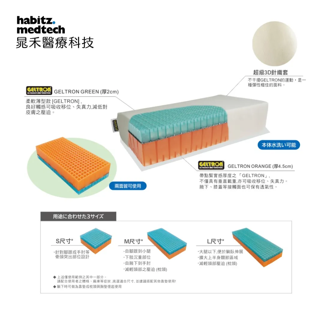 GELTRON Mulch 多款式靠墊適用於體位變換、定位與局部減壓,可支撐身體各部位;其固態凝膠結構能吸收來自多方向的壓力,減輕皮膚與肌肉負擔,同時具優異透氣性以降低悶熱感、維持舒適。雙面設計可依需求使用:上層為薄型 GELTRON GREEN(厚 2 cm)觸感柔軟、降低壓迫;下層為較厚實的 GELTRON ORANGE(厚 4.5 cm)兼具承重與吸收位移力,接觸面仍能保有透氣性;並提供 S/M/L 三種尺寸,搭配彈性佳的 3D 針織套不影響凝膠活動。