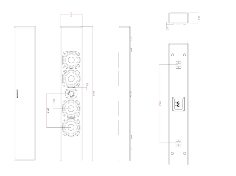 - M90 的每組低音單元都位於獨立的抗共振聲腔內,中間兩個低音單元負責中音,另外兩個低音單元負責低頻。這樣做是為了最大限度地減少超薄音箱常見的失真和箱體共振。