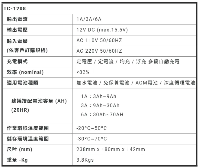 | 充電模式 | 定電壓 / 定電流 / 均充 / 浮充 多段自動充電 |