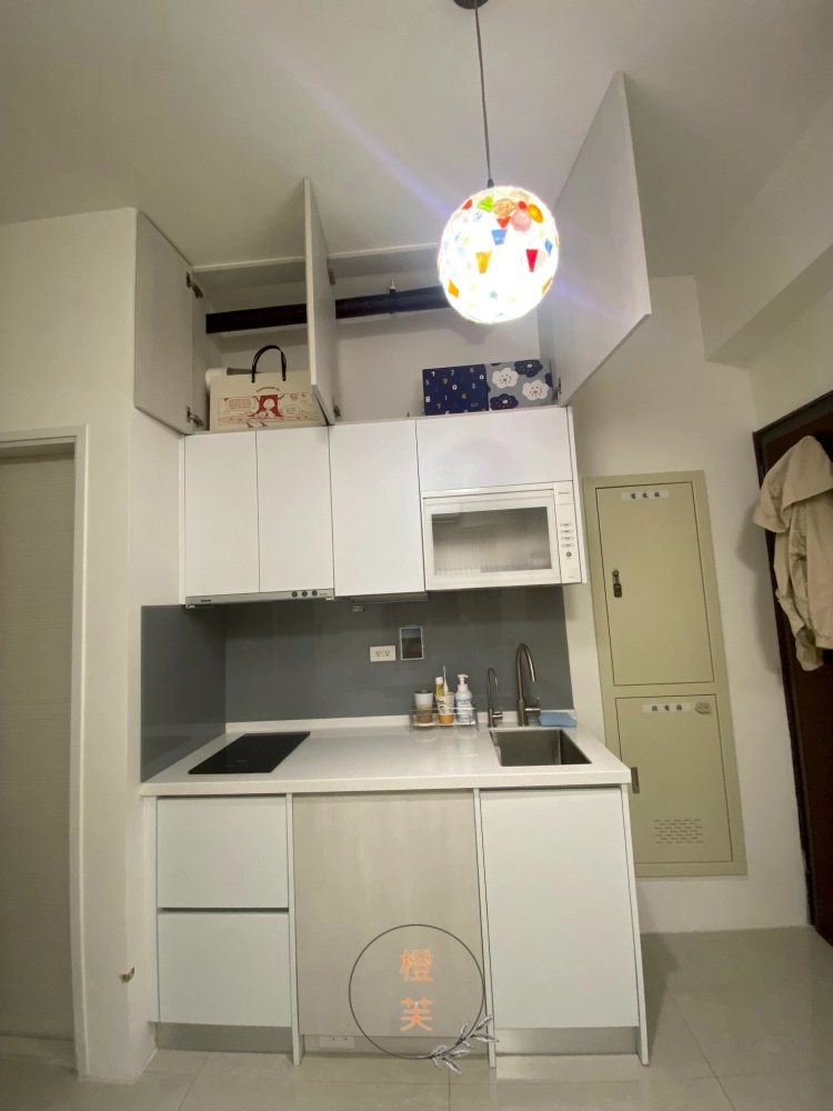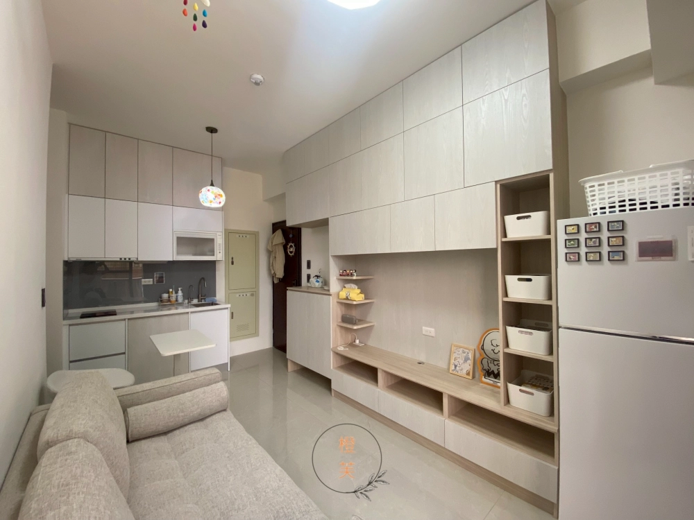 一房一廳設計圍利用牆面的高度設置儲物櫃,把不常用的物品存放在上層,讓地面空間更加清爽。 使用白色、米色、淺灰等色調來擴大空間感,避免使用過多深色或花俏的裝飾,打造呈現清新明亮的質感小宅。