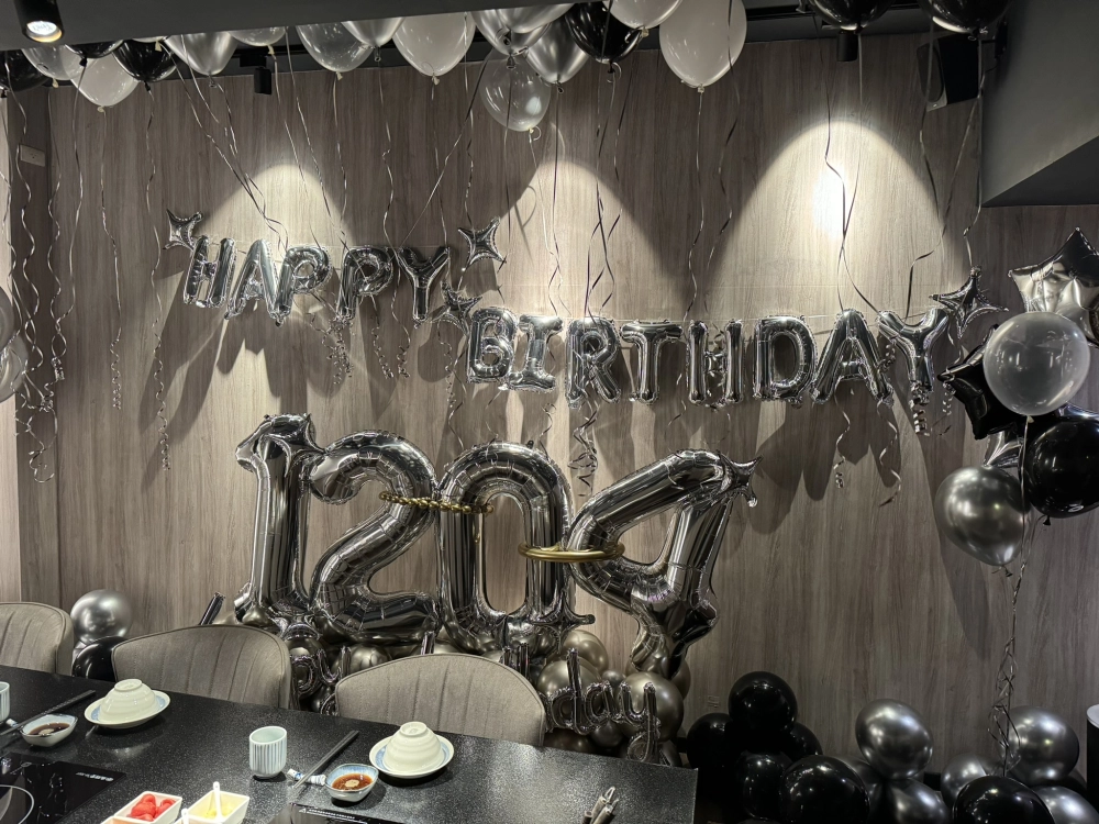 氣球布置, 生日氣球佈置, HAPPY BIRTHDAY 字母氣球, 銀色氣球牆, 黑白銀氣球, 數字氣球 1204, 台北氣球設計, 室內派對佈置, 餐桌氣球布置, 派對到府服務