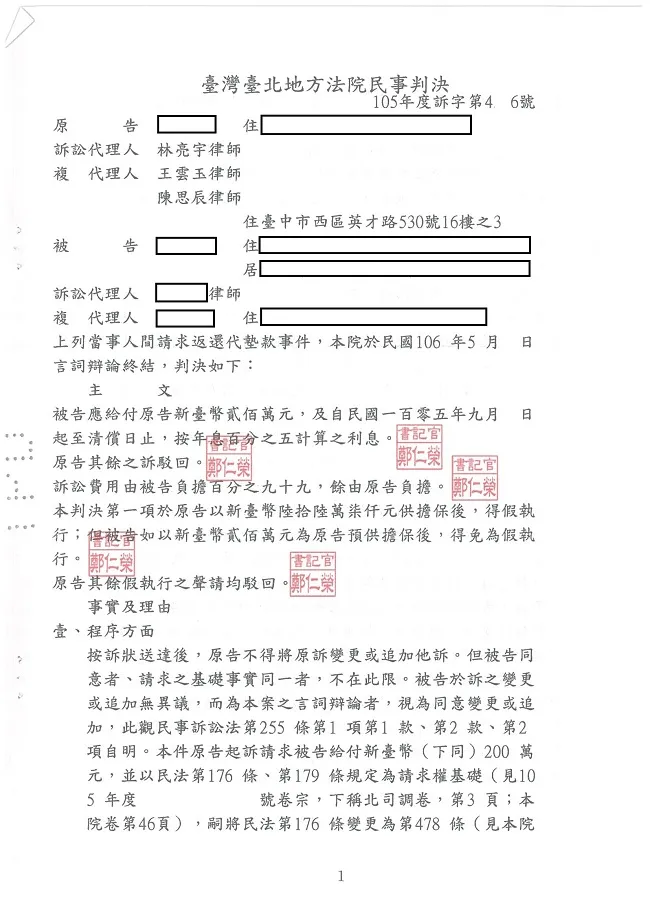 • 親兄弟卻賴皮不明算帳,真亮法律事務所受託辦理一審、二審,全部勝訴確定。